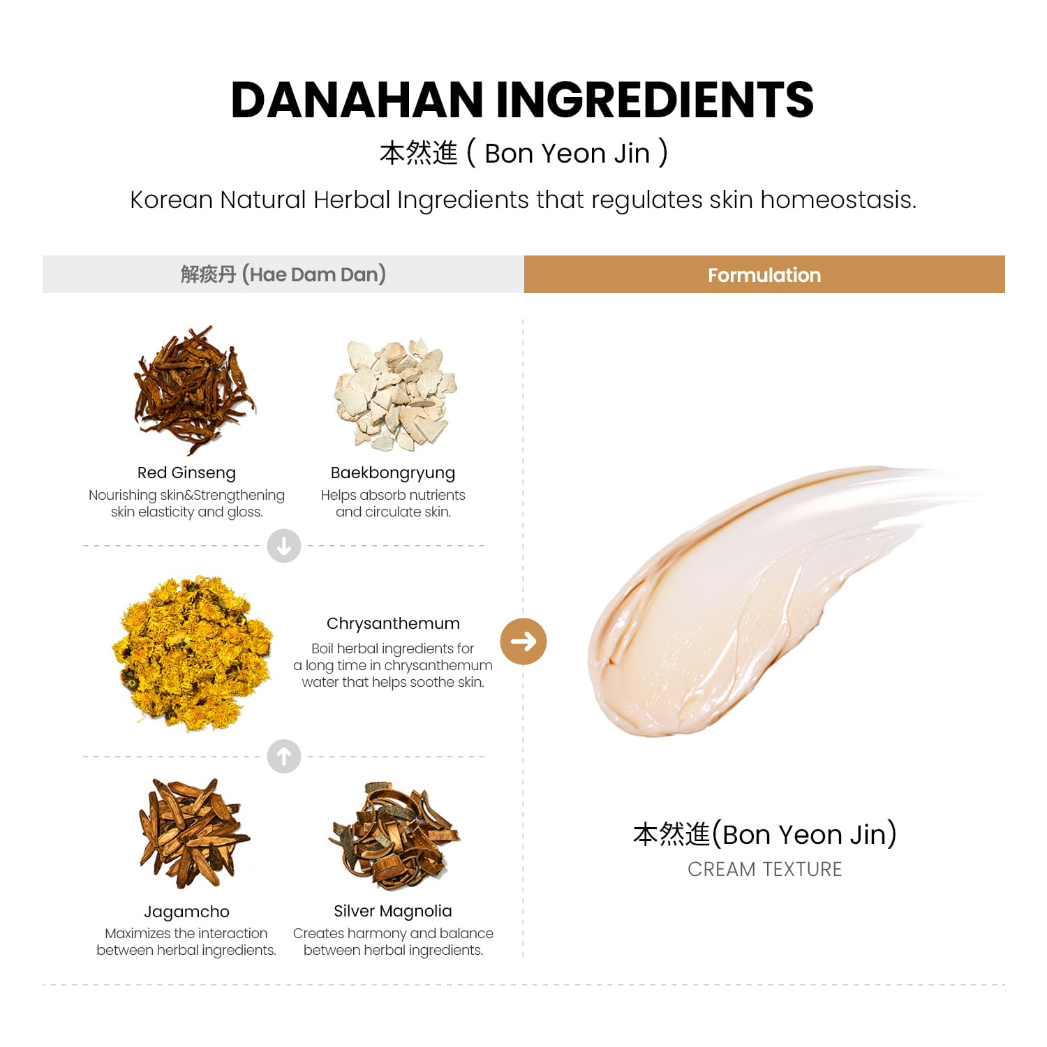 - Danahan Bon Yeon Jin is made with a powerful skin-rejuvenating formula of high-quality Red Ginseng and natural Korean natural herbal medicine to hydrate, nourish, and visibly rejuvenate skin.