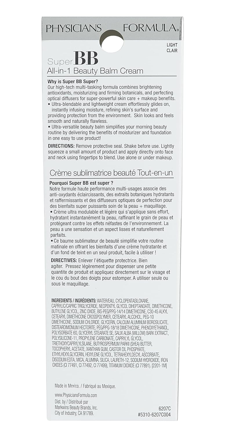 Physicians Formula Super BB Cream All in 1 Beauty Balm Foundation Cream SPF 30, Light | Dermatologist Tested, Clinicially Tested