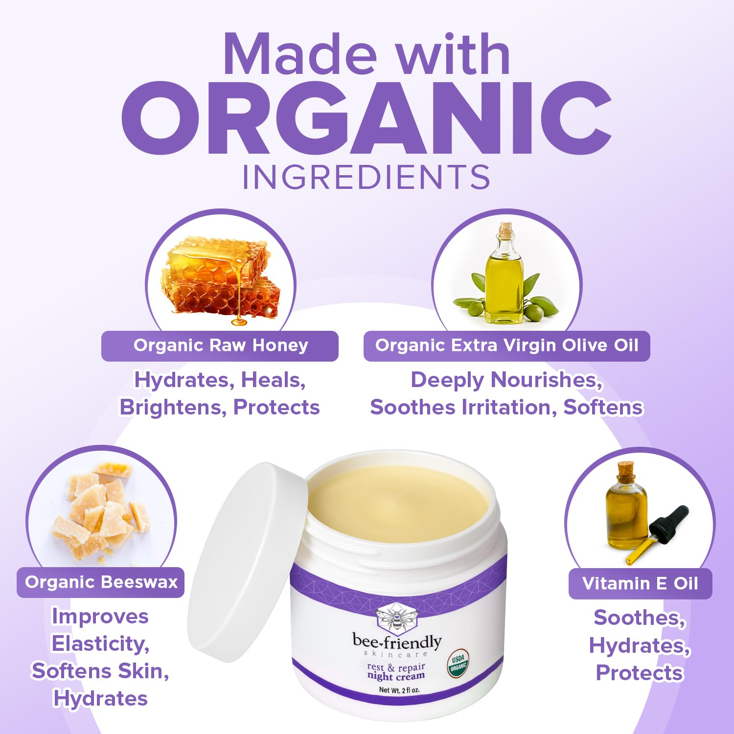 BeeFriendly Organic Night Cream, USDA Certified Organic, Deep Hydrating & Moisturizing Night Time Eye, Face, Neck & Decollete Cream for Women and Men, Anti Aging, Anti Wrinkle 2 oz