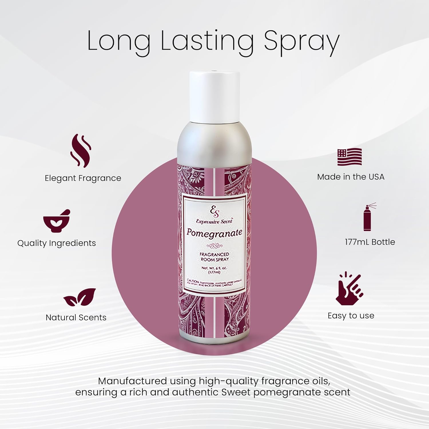 - LONG-LASTING AROMA & FRESHNESS ENHANCER: Crafted with a blend of organic Pomegranate Ingredients, Expressive Scent Room spray delivers a Long-Lasting Fragrance that keeps your home, office, bathroom or car smelling fresh day and night. Perfect for any space, this air refresher and room freshener creates the ideal ambiance and leaves a lasting impression.