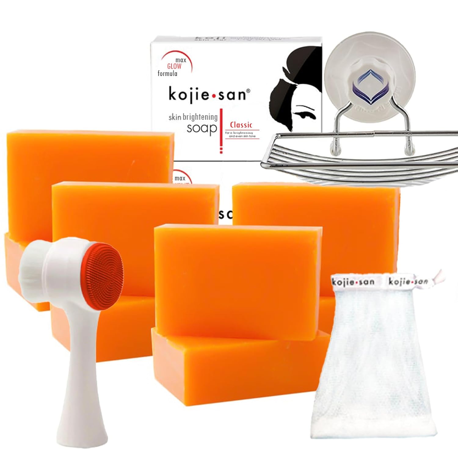 Kojie San Face & Body Shower Set - The Original Kojic Acid Soap, Dark Spot Remover Bar Soap with Coconut & Tea Tree Oil – 65g x 8 Bars with Leafa Soap Net, Brush and Soap Dish