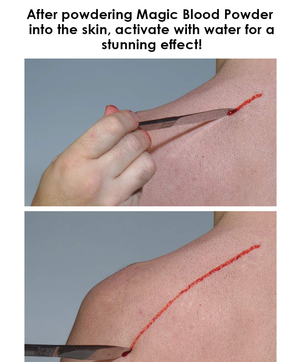 - Magic Blood Powder: A water-activated powder that when applied is invisible, but when sprayed with water looks like the result of a motor cycle accident. Drag a dull wet prop knife across powdered skin for a bloody cutting effect.