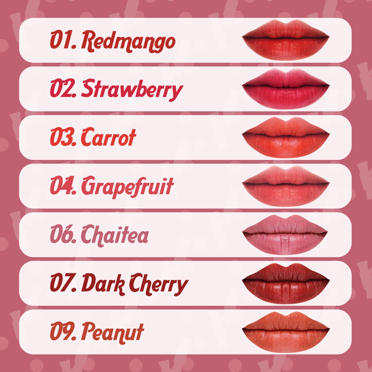 - POWDERY MATTE FINISH: The thin and light mousse texture offers soft and easy gliding with a matte finish. This natural lip stain delivers color and healthy hydration. Our lipstick is formulated to suit every lip type and color as the nutrients in our lip tint conditions and protect lips from unrestrained radicals.