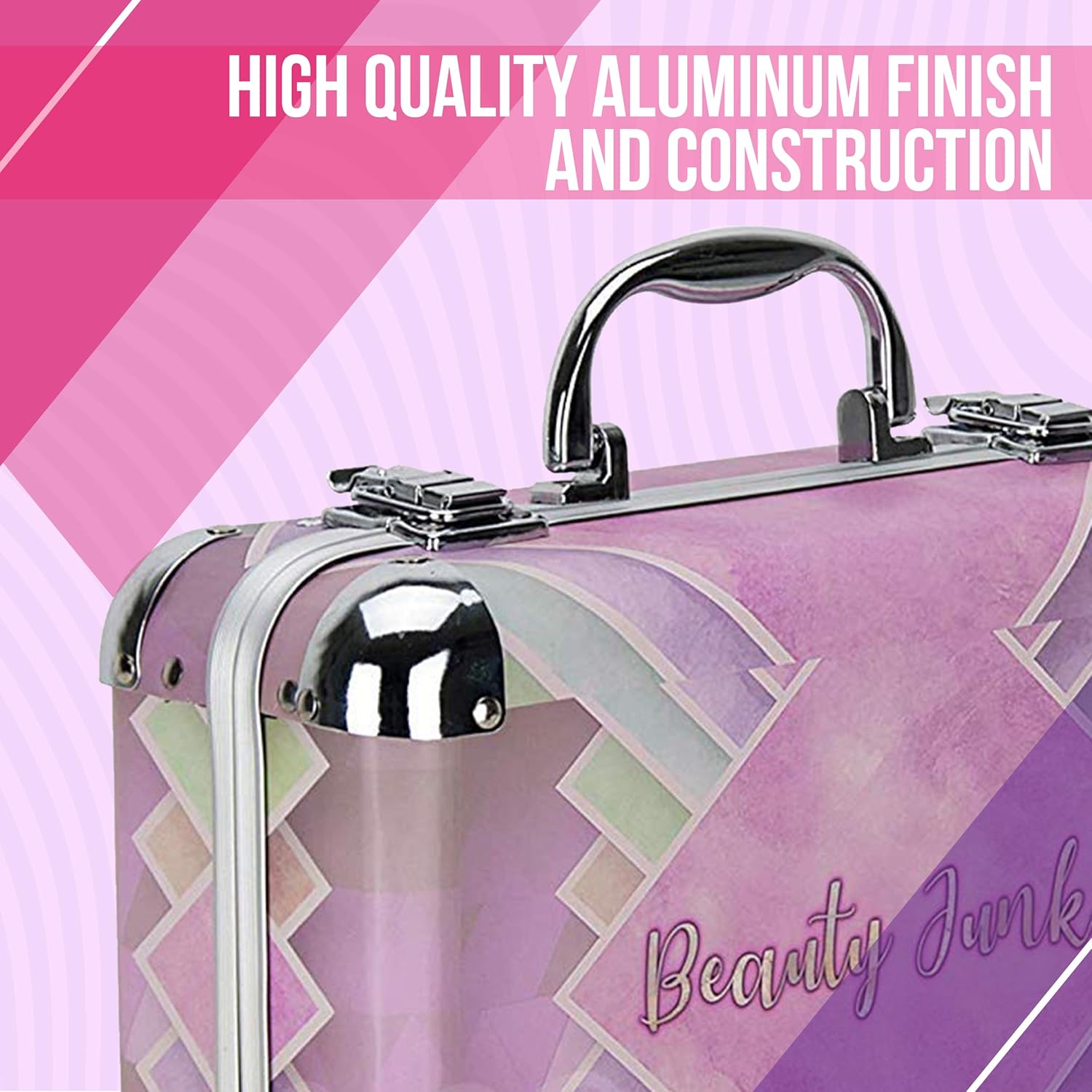 - Portable Storage Organizer - Teen makeup kit in a stylish pastel ‘Beauty Junkie’ design that will complement your style; Impact and scratch resistant; Designed for carrying, displaying, and traveling with jewelry & cosmetics