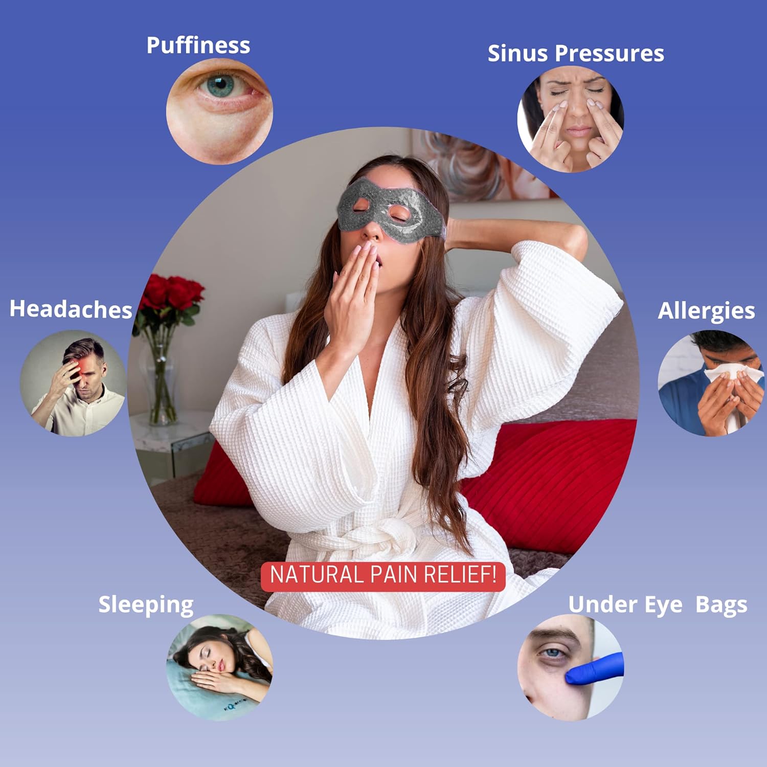 - SOOTHING TREATMENT FOR MANY ACHES AND PAINS - Use the Velcro-like strap to secure it, and in as few as 5 minutes you’ll feel relief. The eye pad helps Swelling, Puffiness, Dryness, Dark Circles, Under Eye Bags, Headaches, TMJ, Allergies, Sinus Issues, Bruxism, Acne, Blackheads, Sleeping, and Aging Skin.