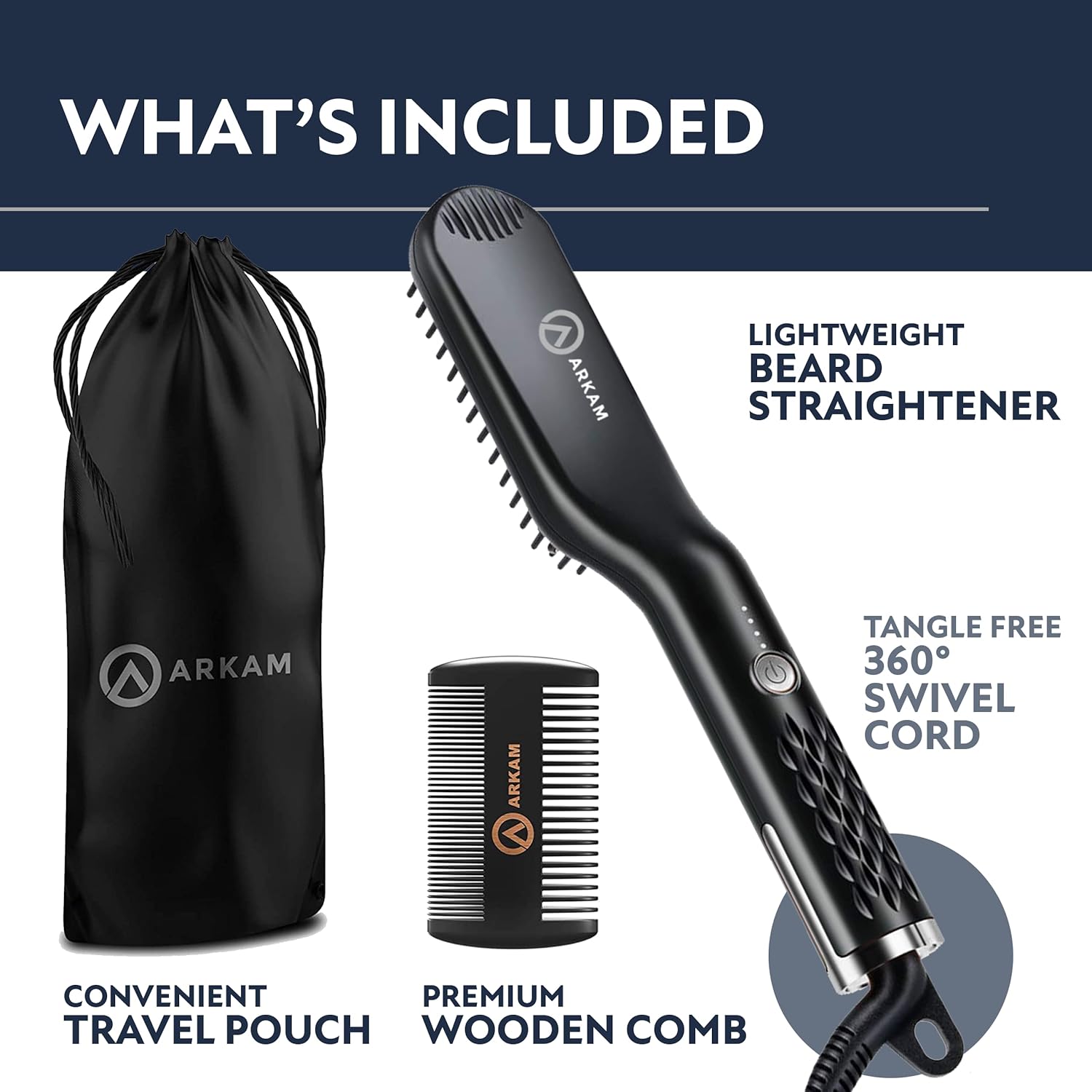 Arkam Beard Straightener for Men - Original Heated Beard Brush Kit w/Anti-Scald Feature, Dual Action Hair Comb and Travel Bag for Short to Medium Beards -Costume Accessories and Grooming Gifts for Men