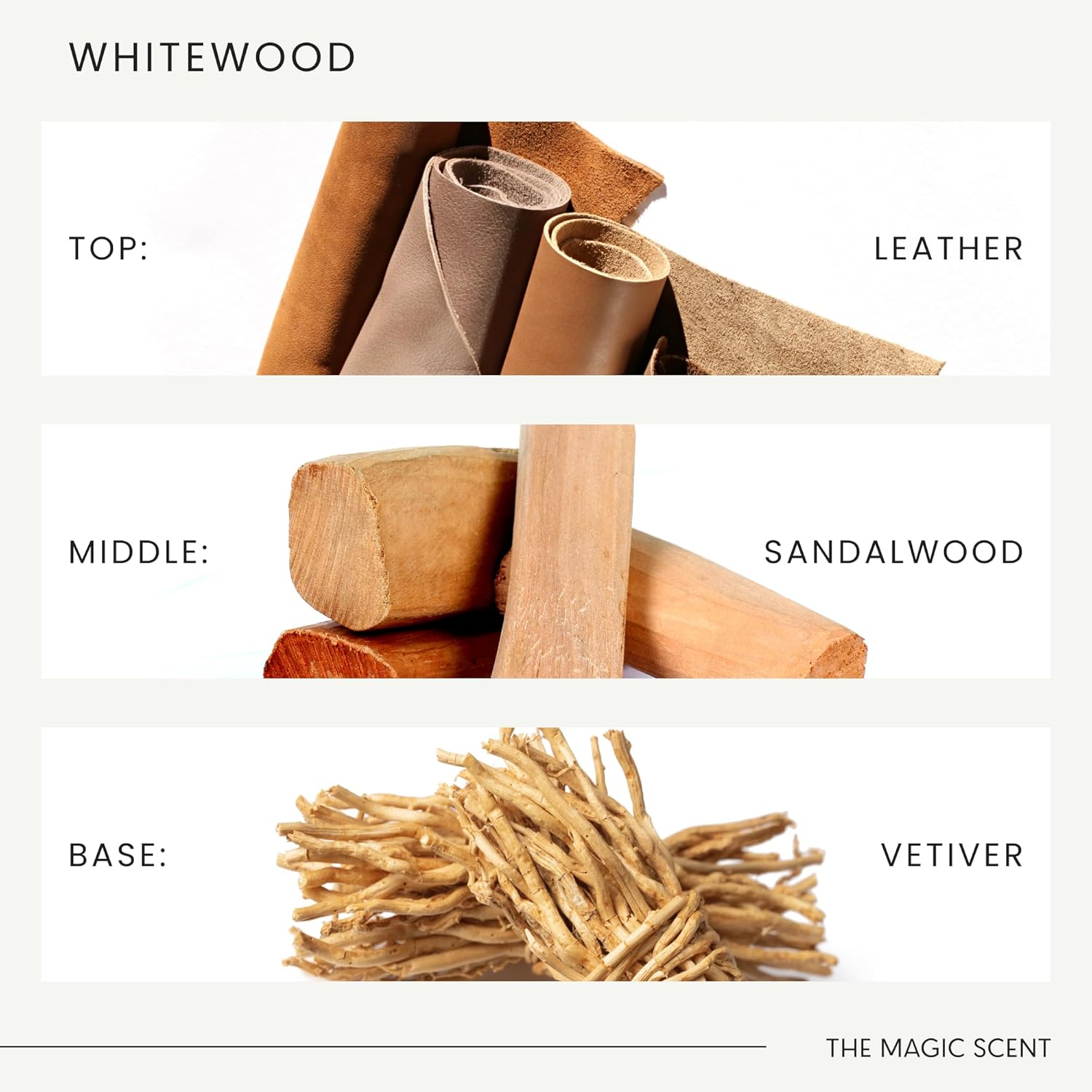- PREMIUM BLEND OF NATURAL DIFFUSER OIL SCENTS - Expertly made in Miami, USA, Whitewood presents an exquisite mixture comprised of calming sandalwood, cedarwood, & mint. Spicy-sweet notes of cardamom & the savory rawness of leather complete the scent and add an edge of seduction and piqued attention.