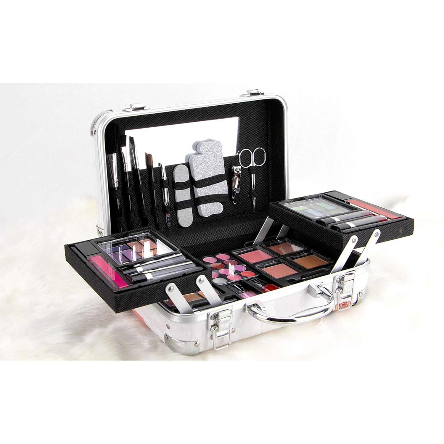 - Professional Makeup Kit - Featuring 24 eyeshadows, 4 blushes, 6 lipsticks, 2 lip glosses, 12 lip balms, 2 nail polishes, and 1 built-in mirror under the lid; Also includes: face, lip, & eye brush, tweezer, nail file, separator, clipper, scissors, and sponges