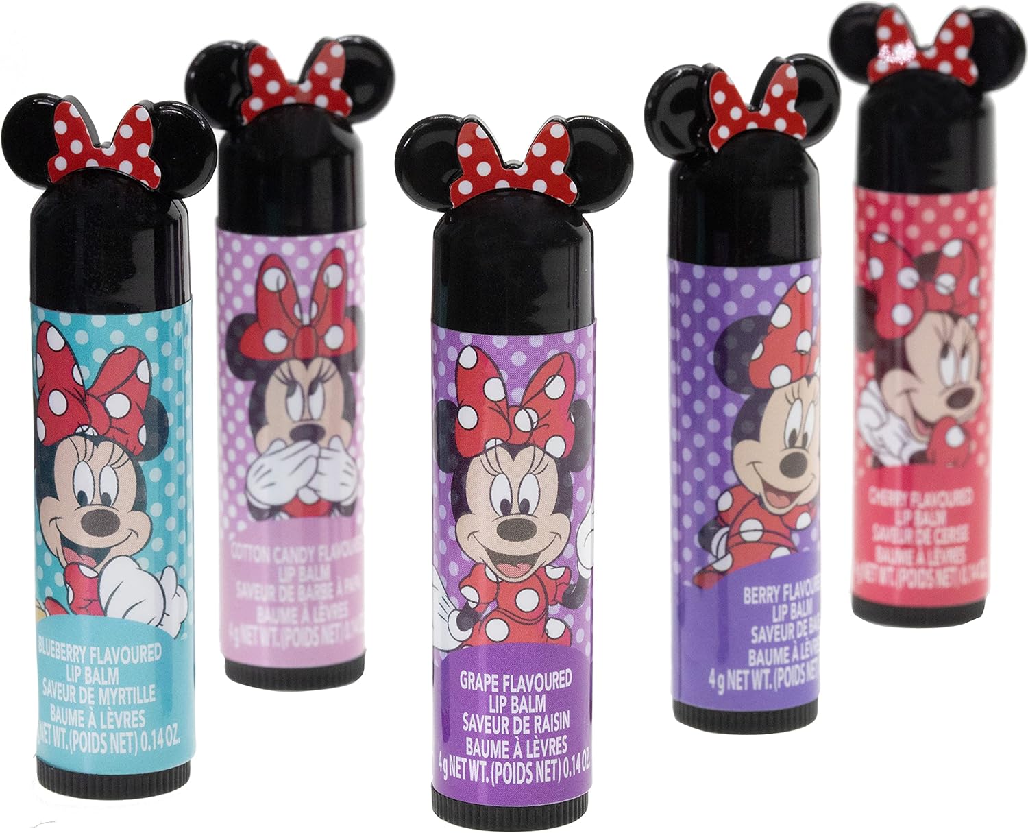 - KIT INCLUDES - Cosmetic Makeup Set Includes 5 Lip Balms with Minnie Mouse Ears Caps. 1 Pink Shimmer- Cotton Candy Flavor. 2 Light Purple Shimmer- Berry Flavor. 3 Red Shimmer-cherry Flavor. 4 Dark Purple- Grape Flavor. 5 Blue Shimmer- Blueberry Flavor. 4 Water-based, Non-toxic, Peelable Nail Polish with Minnie Mouse Ear Caps: Prussian Blue, Red, Peach Shimmer, Violet Shimmer. All Are Bubble Gum Scented.1 Sheet Of 25 Nail Stickers. 1 Minnie Shaped Nail File.