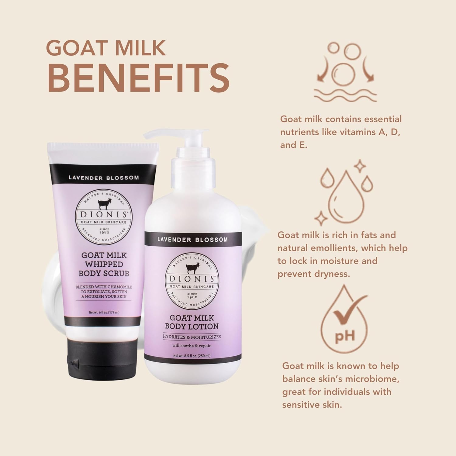 - Skin's Best Friend - The Dionis goat Milk Skincare Lotion is rich and creamy. With regular use it’s designed to ease rough skin, making it smooth and silky. It also does not leave a greasy residue like many lotions, so you can apply it right before putting on your favorite sweater.