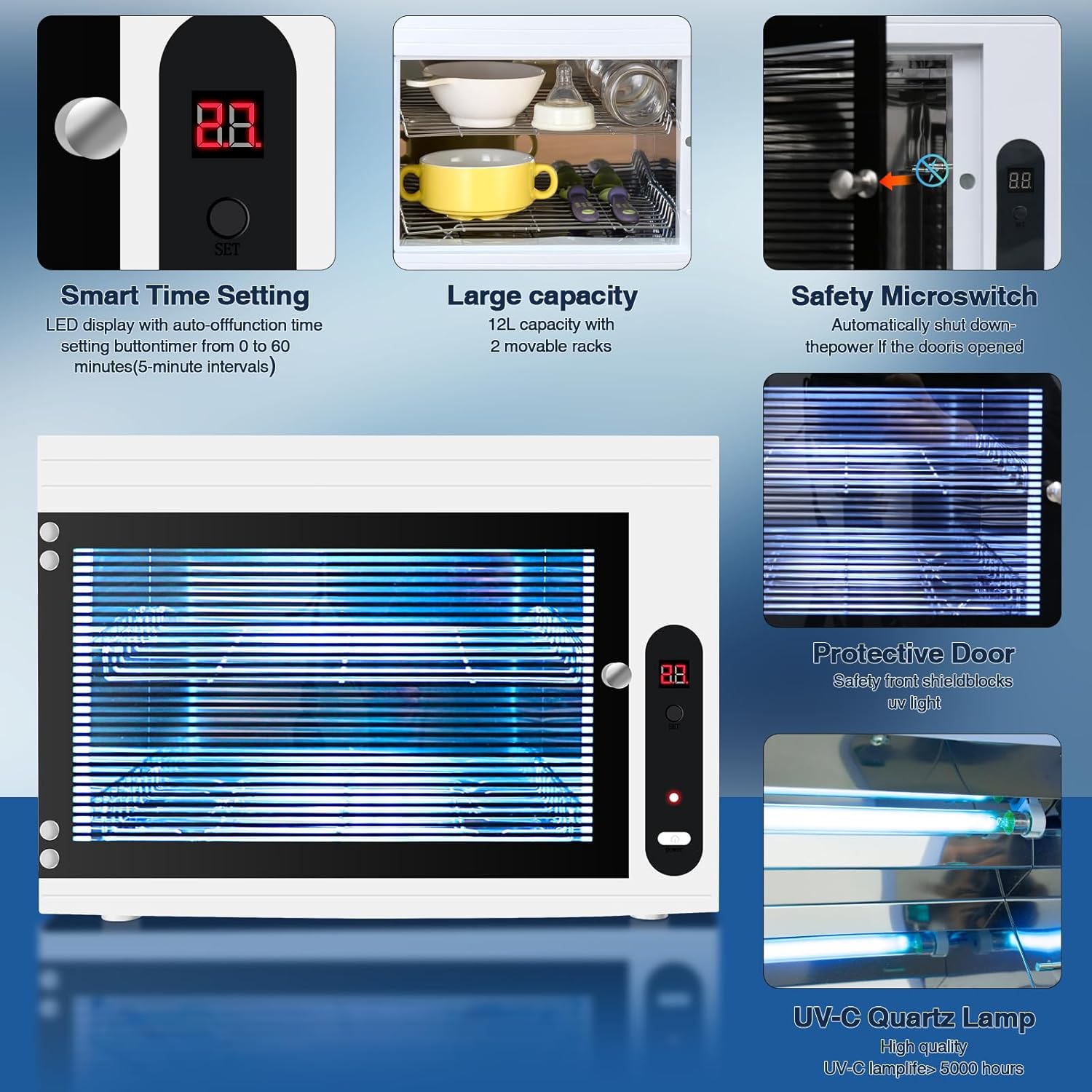 - [Safe and Convenient] The UV light features a powerful magnetic door, a high-brightness stainless steel container, and a metal shelf. When the door is opened, the light automatically turns off, and it turns back on when the door is closed.