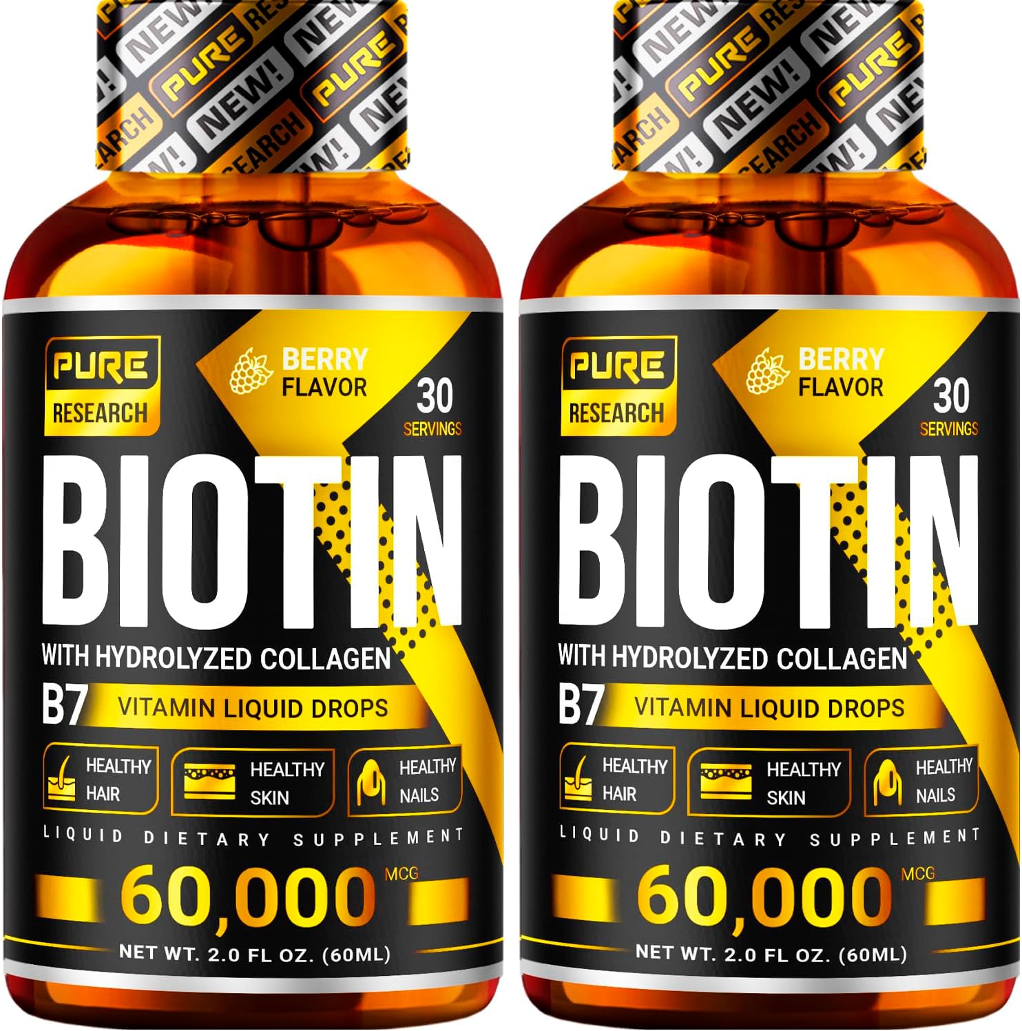 PURE RESEARCH Biotin & Collagen 60,000mcg Hair Growth Liquid Drops, Supports: Strong Nails, Glowing Skin, Healthy Hair Growth, More Absorption Than Capsules & Pills (4Fl Oz)