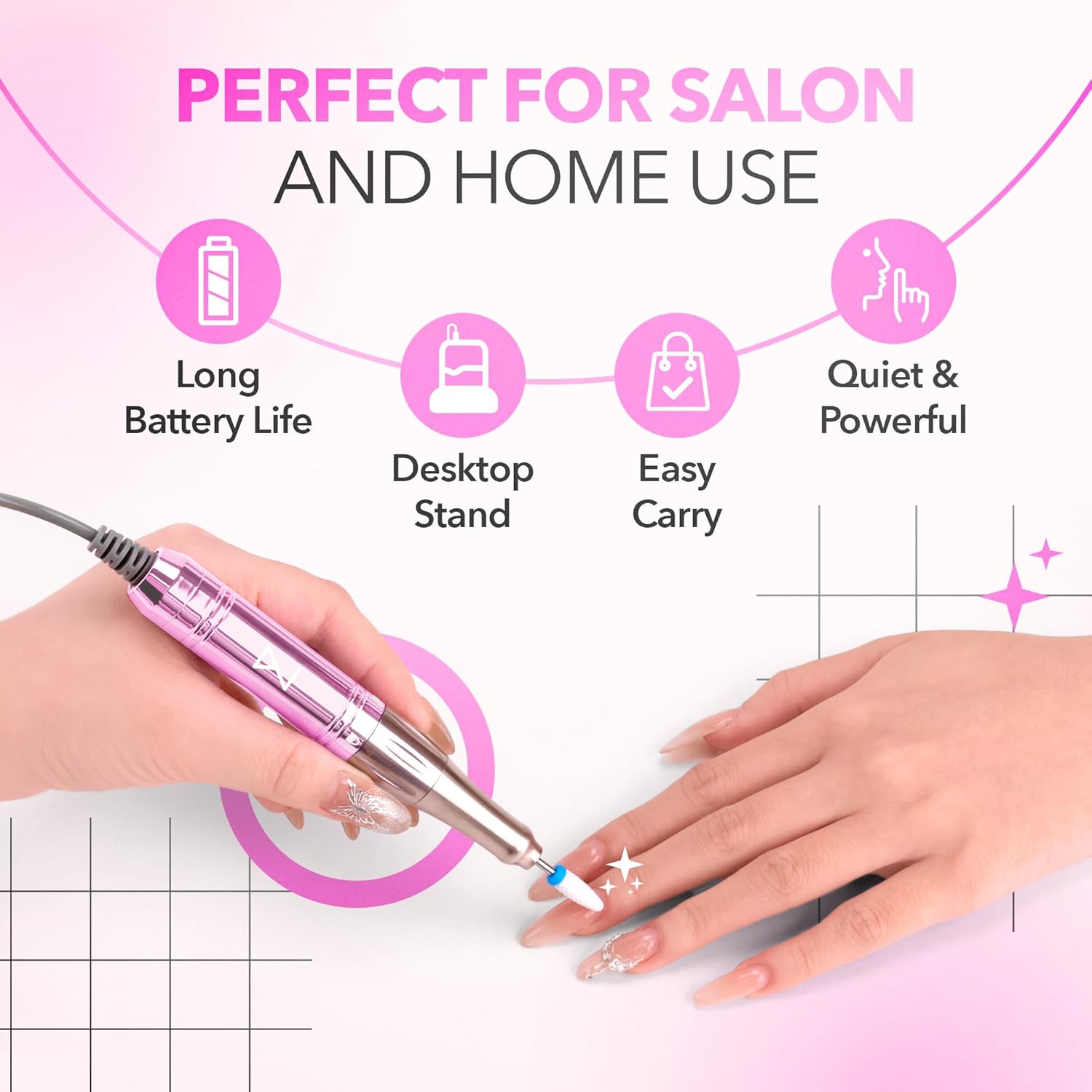 M Mase- Professional Nail Drill Machine - Coreless 2-in-1 Nail File - Electric, Cordless, 35000 RPM, HD Display - Electric Nail Drill for Professional & Home Use (Unicorn Pink)