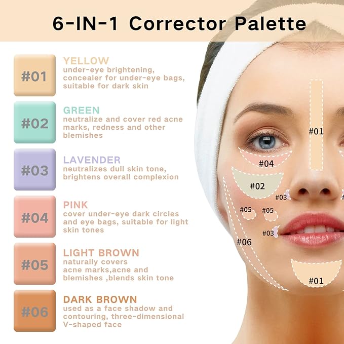 - 6 COLORS CORRECTING CONCEALER PALETTE:YELLOW, under-eye brightening, concealer for under-eye bags, suitable for dark skin;LAVENDER, neutralizes dull skin tone, brightens overall complexion;LIGHT BROWN, naturally covers acne marks,acne and blemishes ,blends skin tone;GREEN, neutralize and cover red acne marks, redness and other blemishes;PINK, cover under-eye dark circles and eye bags, suitable for light skin tones;DARK BROWN, used as a face shadow and contouring, three-dimensional V-shaped face