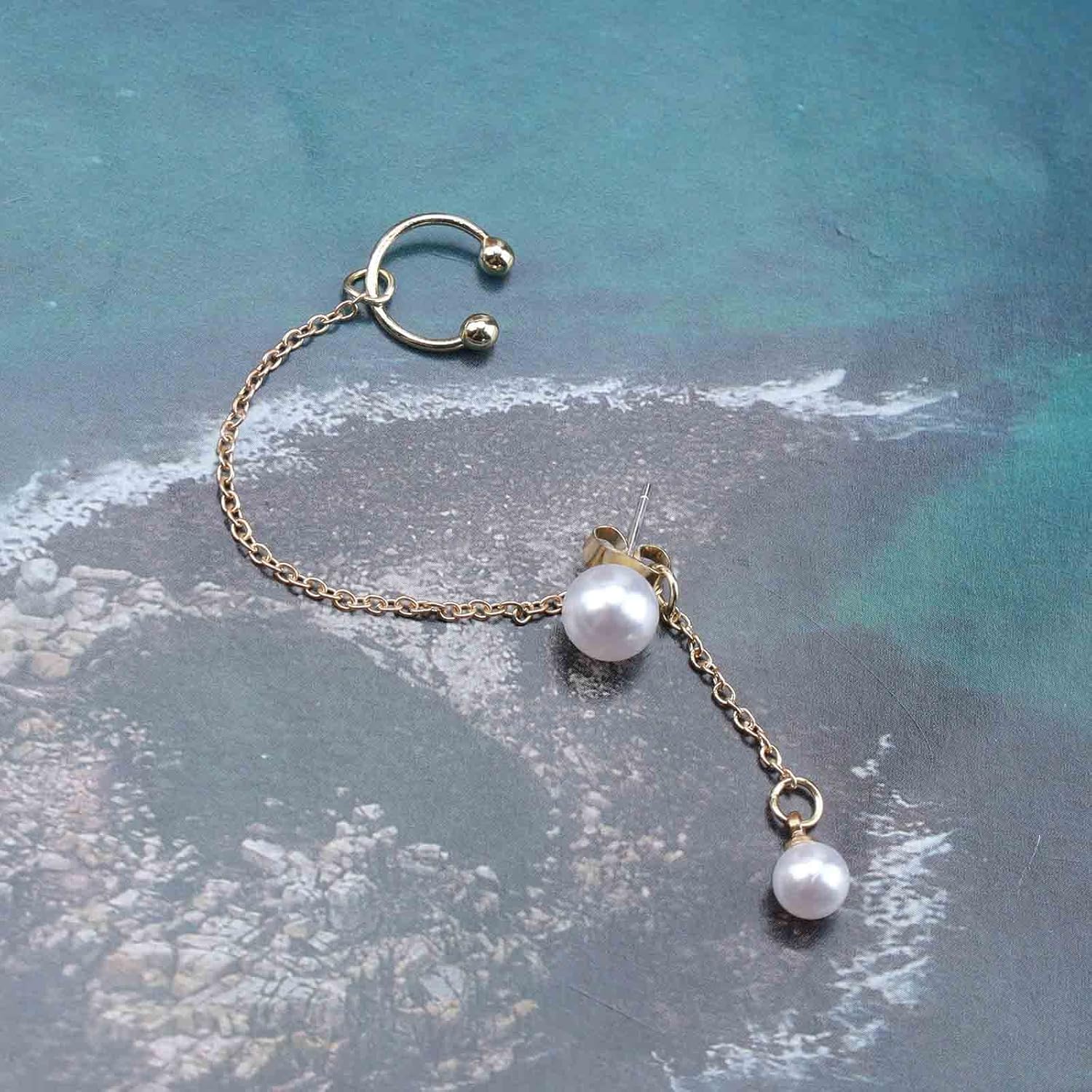 Vintage Pearl Cuff Chain Earrings Gold Chain Ear Cuffs Dangle Chain Cartilage Earrings Pearl Studs Earrings Cartilage Helix Earrings Helix to Lobe chain earrings Jewelry for Women and Girls (Gold B)
