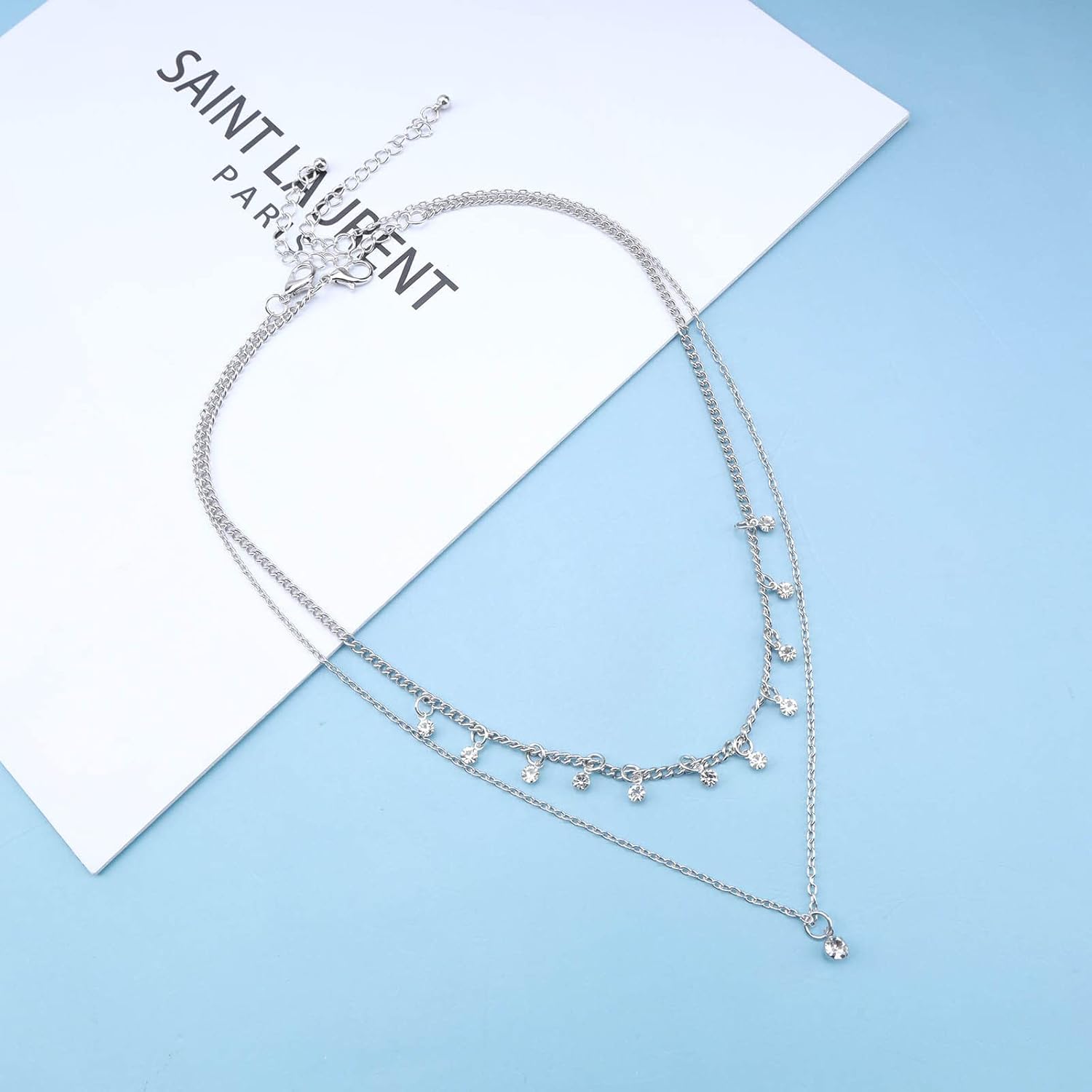 Boho Layered Silver Choker Necklace Crystal Pendant Necklace Rhinestone Tassel Choker Necklace Sparkly CZ Dangle Necklace Chain Jewelry for Women and Girls (Silver)