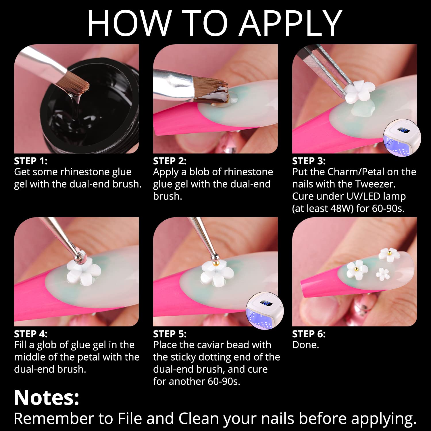 - WHAT YOU WILL RECEIVE -- The package contains 2 boxes of ornaments for manicure and 1 pot of 8ml No Wipe rhinestone glue gel with necessary dotting pen and tweezer. The embellishment set includes bling starry AB gems for nails, AB white flatback pearls, metal ball chain, 3D aurora butterfly / bow / bear / flower, etc.