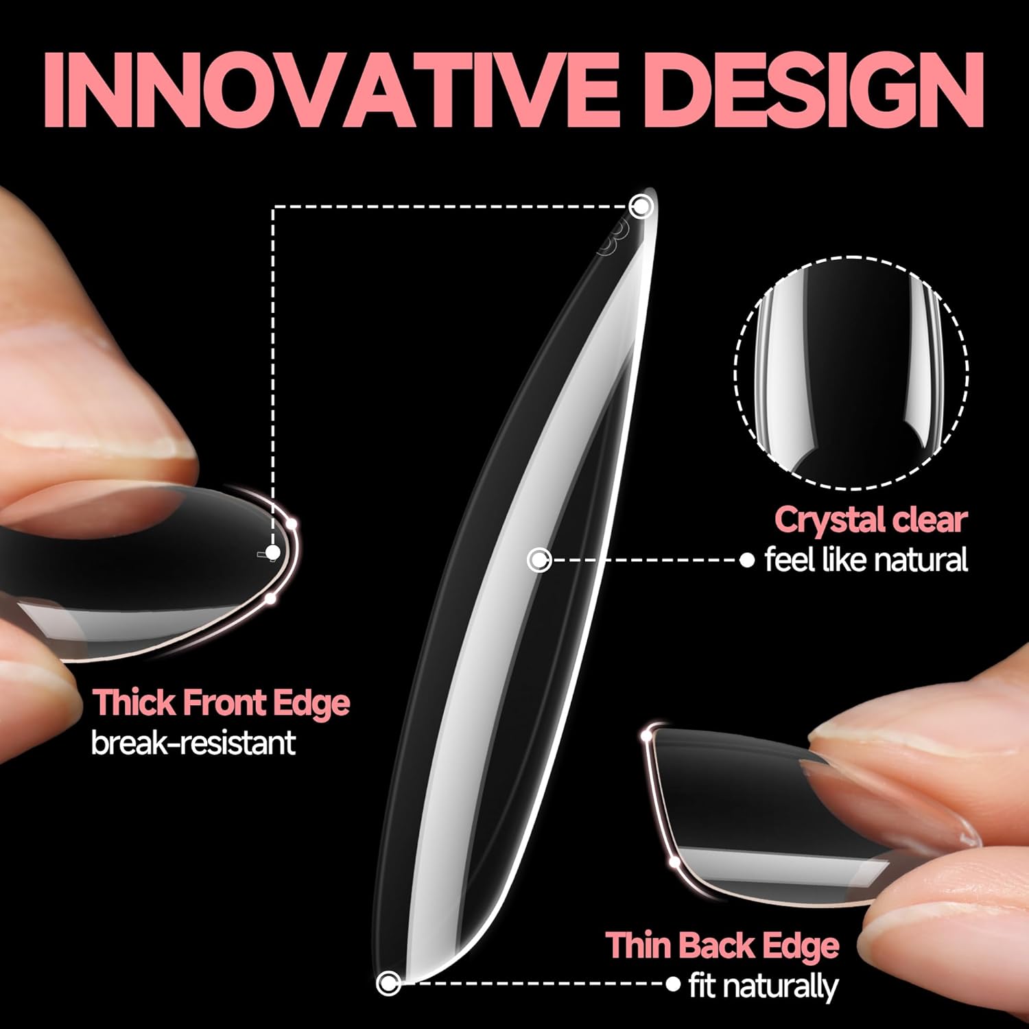 - Professional Almond Shape Tips: Great extension Almond fake tips show a great clear cover with high quality innovate material soft gelly tips can be used with nail polish, dip powder, acrylic acrylic powder, easily make salon nail effect instead of dropping money at expensive salon