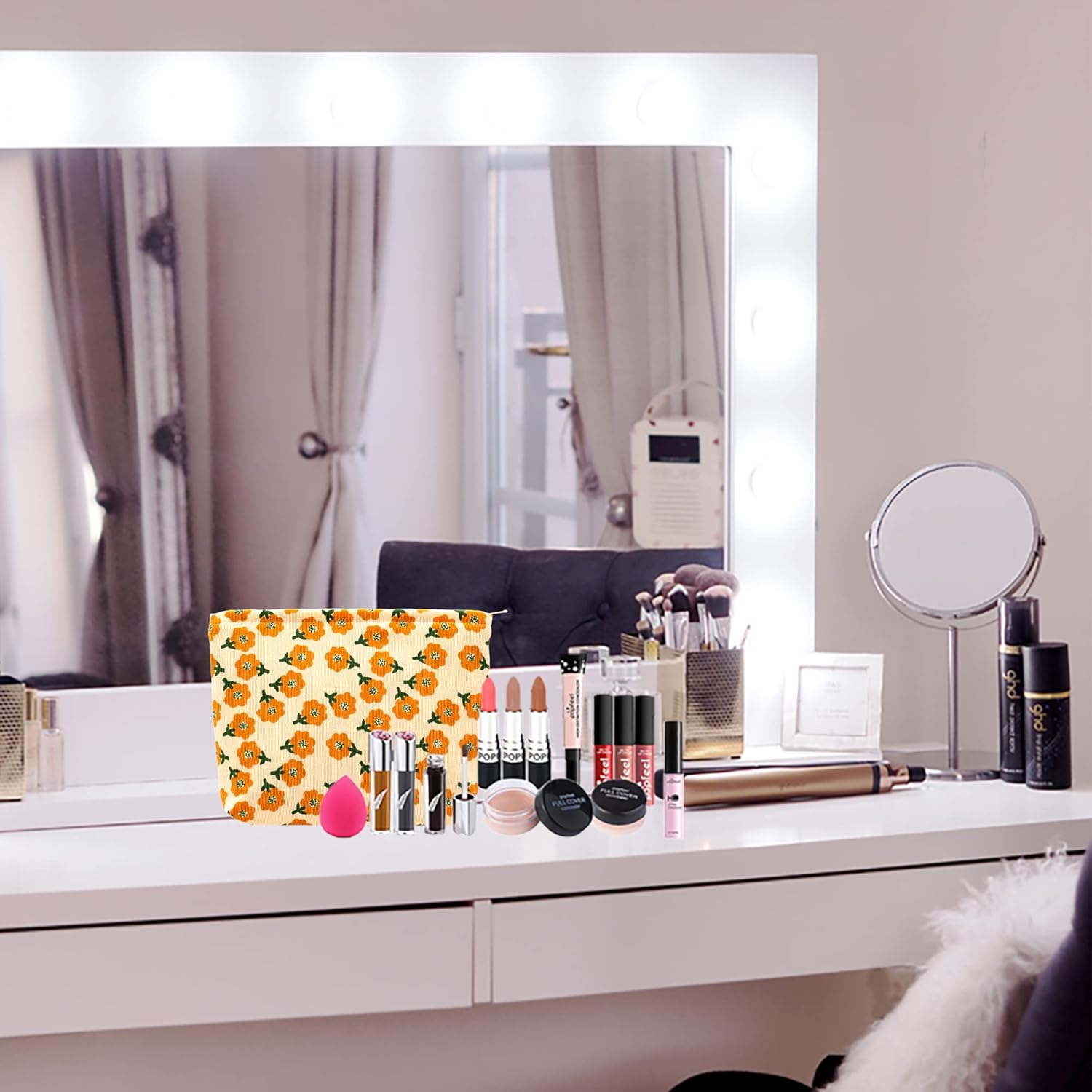 PAZIMIIK Makeup Bag Large Zipper Corduroy Make Up Pouch for Purse Travel Canvas Cosmetic Organizer for Women Brush Storage,Flower Yellow