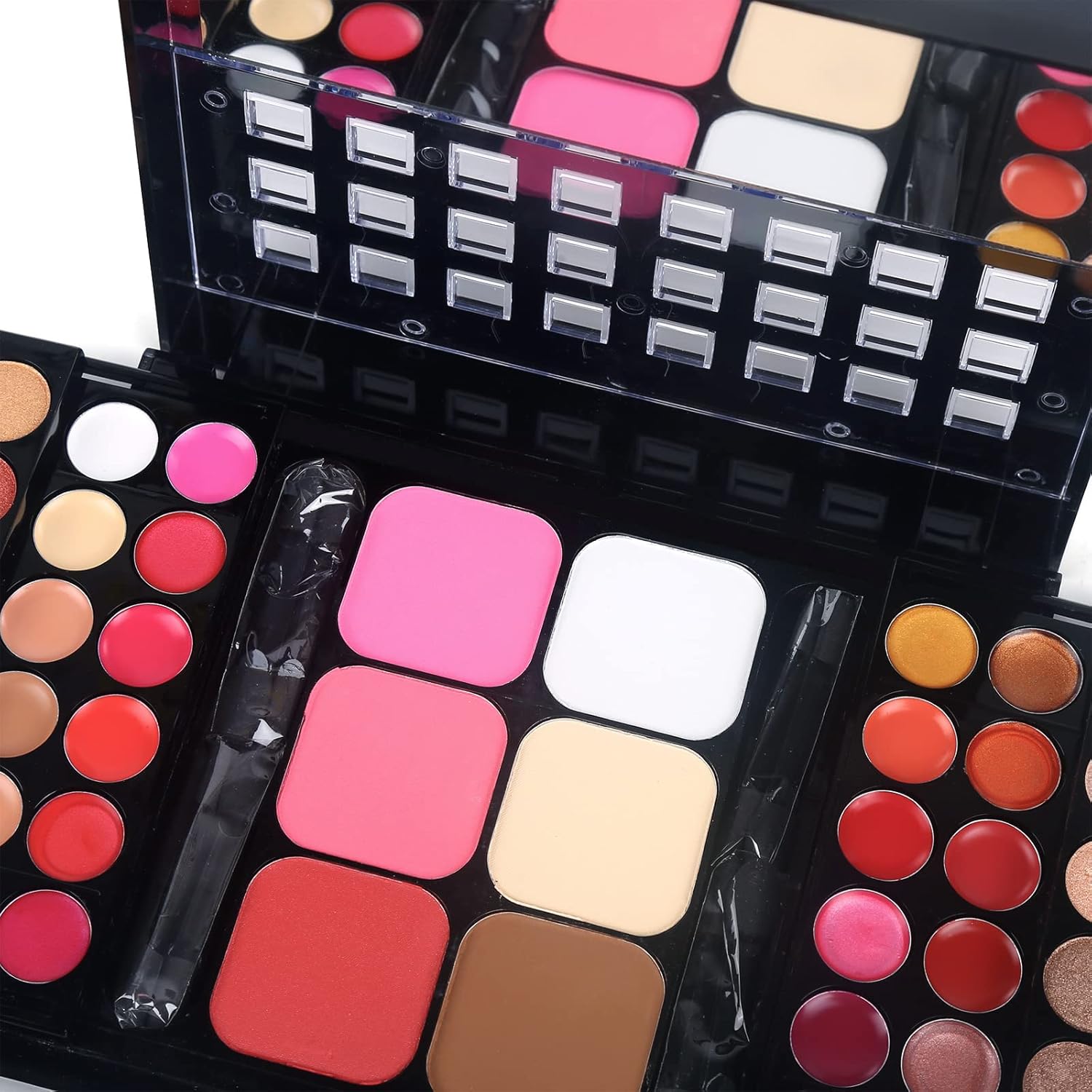 - One Stop Makeup Kit + Mascara + Eye Primer + Eye Brow Powder + Eye Liner + 8 pcs Makeup Brushes + Sponge. - 78 Colors Cosmetic Gift Set is a 3 tiers compact combination of high-quality makeup products and help you look stunning any time. It contains 24 Classic Eyeshadow, 24 Rainbow Vibrant Eyeshadow, 6 Concealer, 18 Creamy Lipstick, 3 Blush, 3 Contour Powder and 1 Mirror.