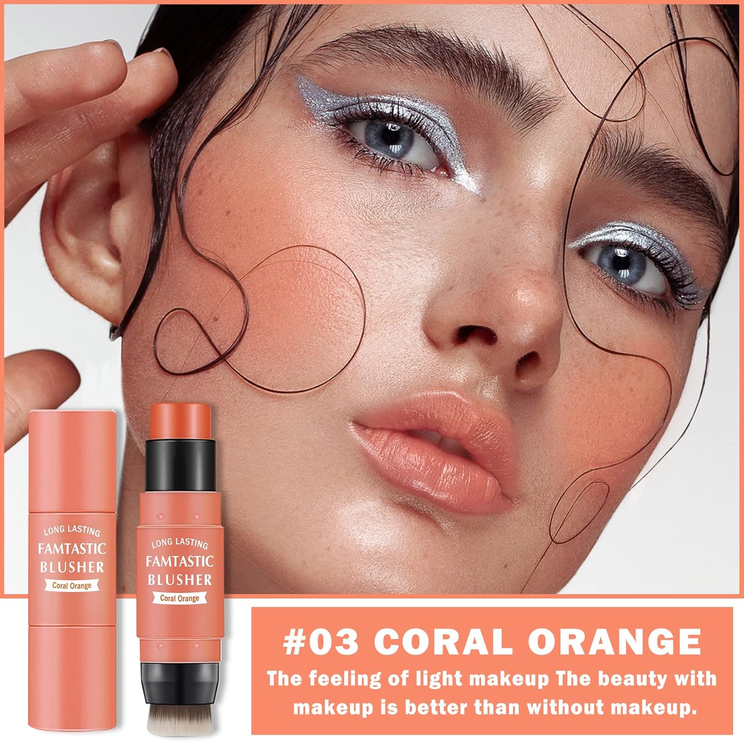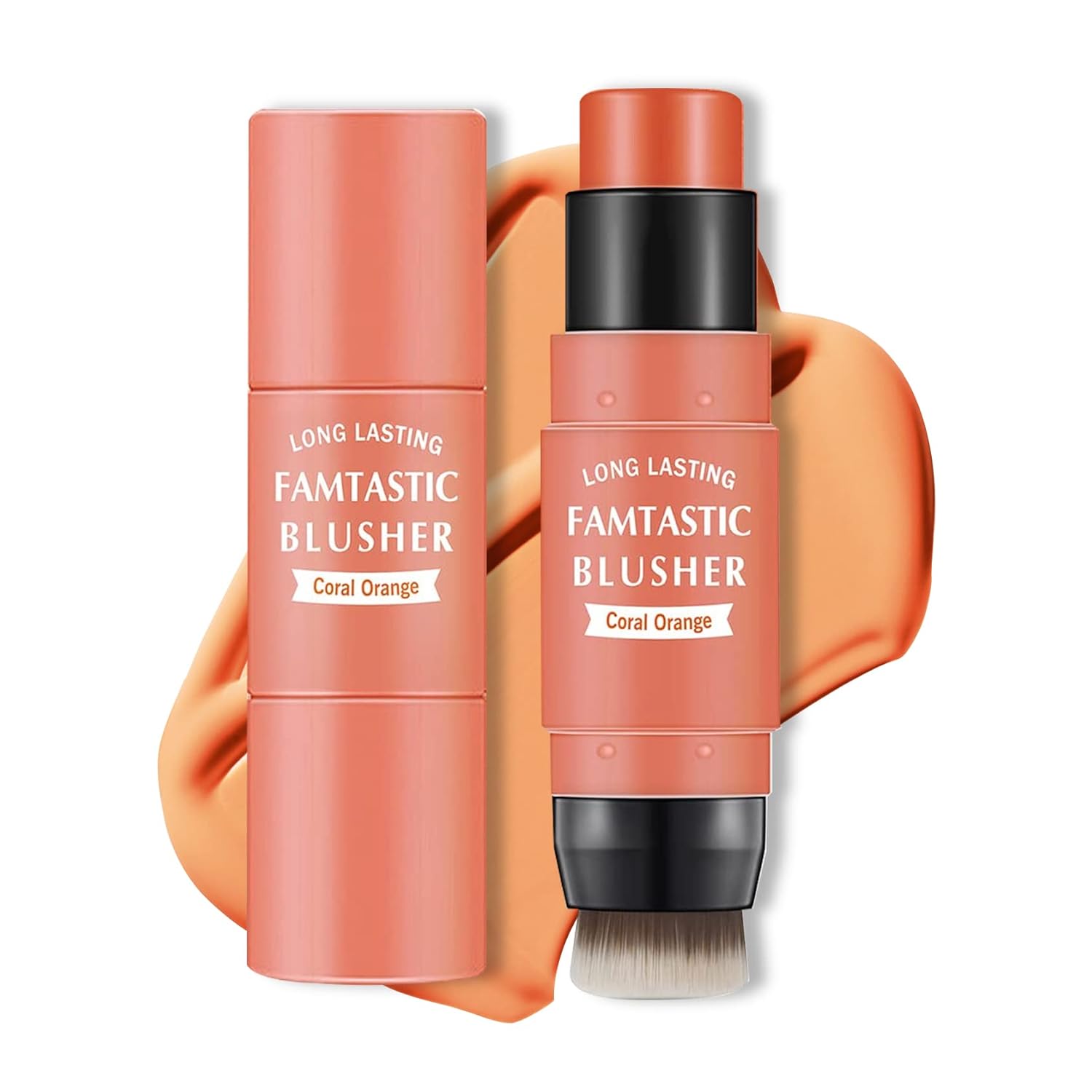 Cream Blush Stick with Brush,Waterproof Blush Makeup,Long Lasting 3 In 1 Cheek Blush & Lip Tint & Eye Shadow Makeup Stick,Easy To Use Blends Effortlessly,Cream Blush Makeup for All Skin Tones - Coral Orange