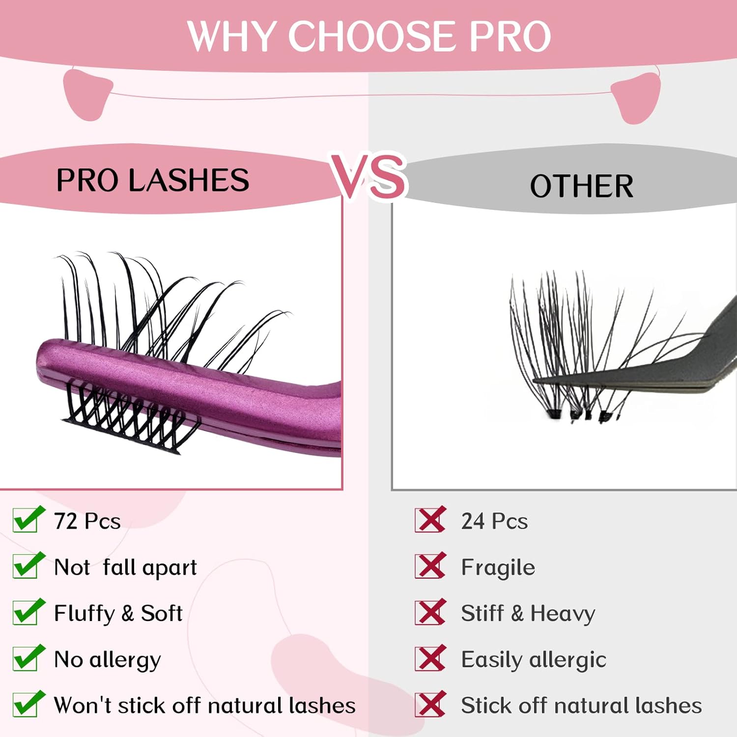- 72 Pcs Cluster Lashes: The Cluster lashes are avaiable now! Different from other brands, PRO LashBeauty can provide 72 pcs in one tray! Mix Length from 8mm to 16mm. You can get more lashes and use more times.