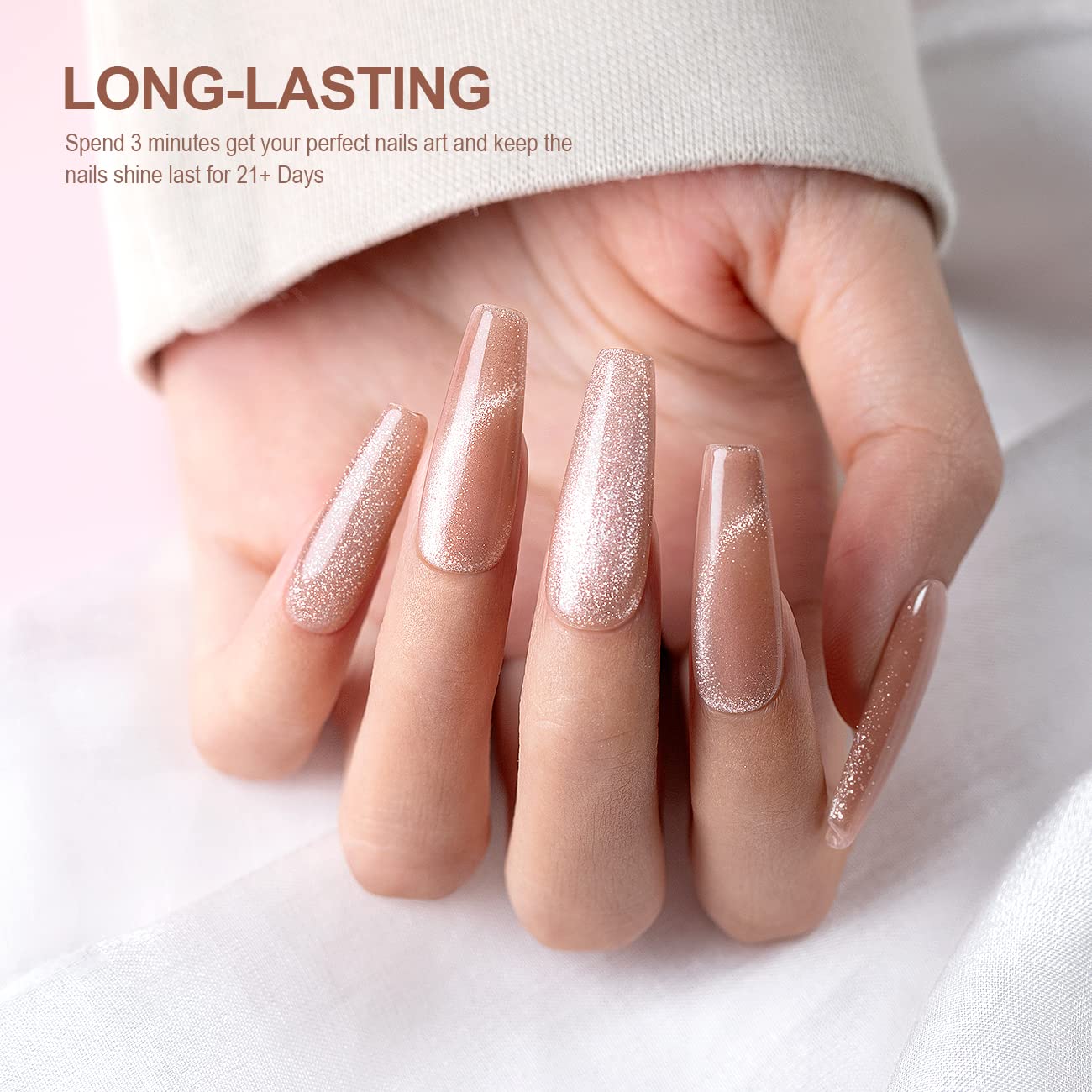 - EASY TO APPLY:This nude color cat eye gel polish is made with with natural resin ingredients,magnetic shimmers,translucent pigments and a smooth formula,so this gel polish set won't cause smudges cracks, or chips.It can last for 21+ days with perfect shine under proper application