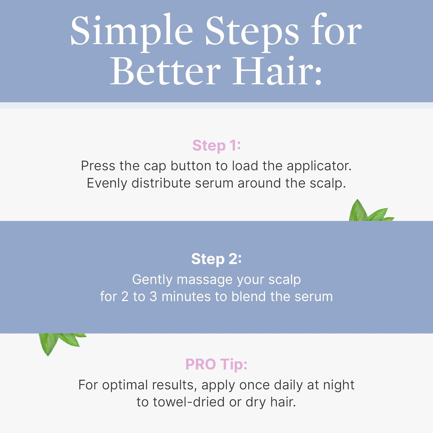 - Steps to Better Hair - Press the cap button to load the applicator. Evenly distribute the serum around the scalp. Gently massage your scalp for 2 to 3 minutes to blend the scalp energizer serum. Pro tip: for optimal results, apply once daily at night to towel-dried or dried hair.