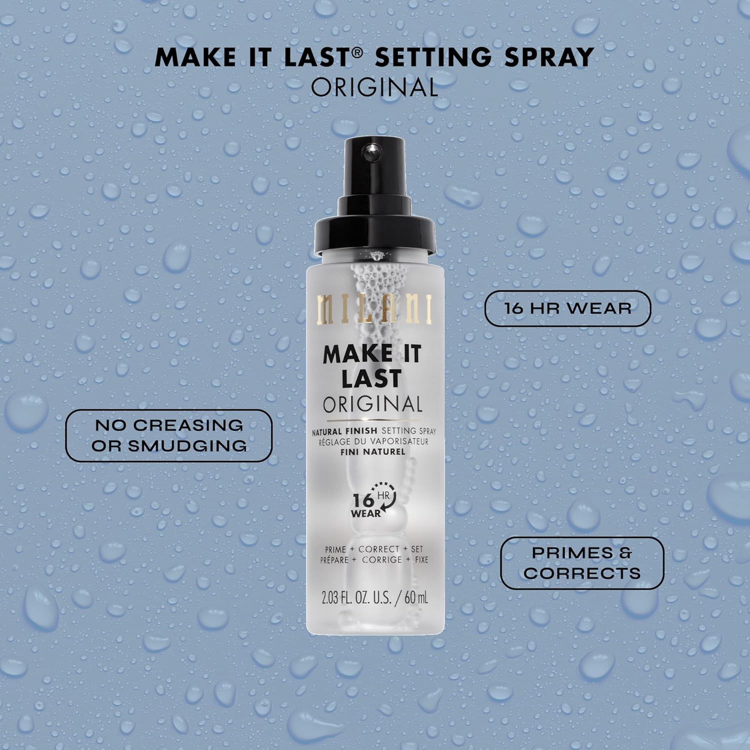 - PRIME + CORRECT + SET: Make It Last Prime + Correct + Set Setting Spray preps your face, reduces the appearance of imperfections and then locks in for the long haul. You can enjoy up to 16 hours without a crease or smudge in sight. Spray before or after makeup application, or wear it alone for a captivating natural finish.