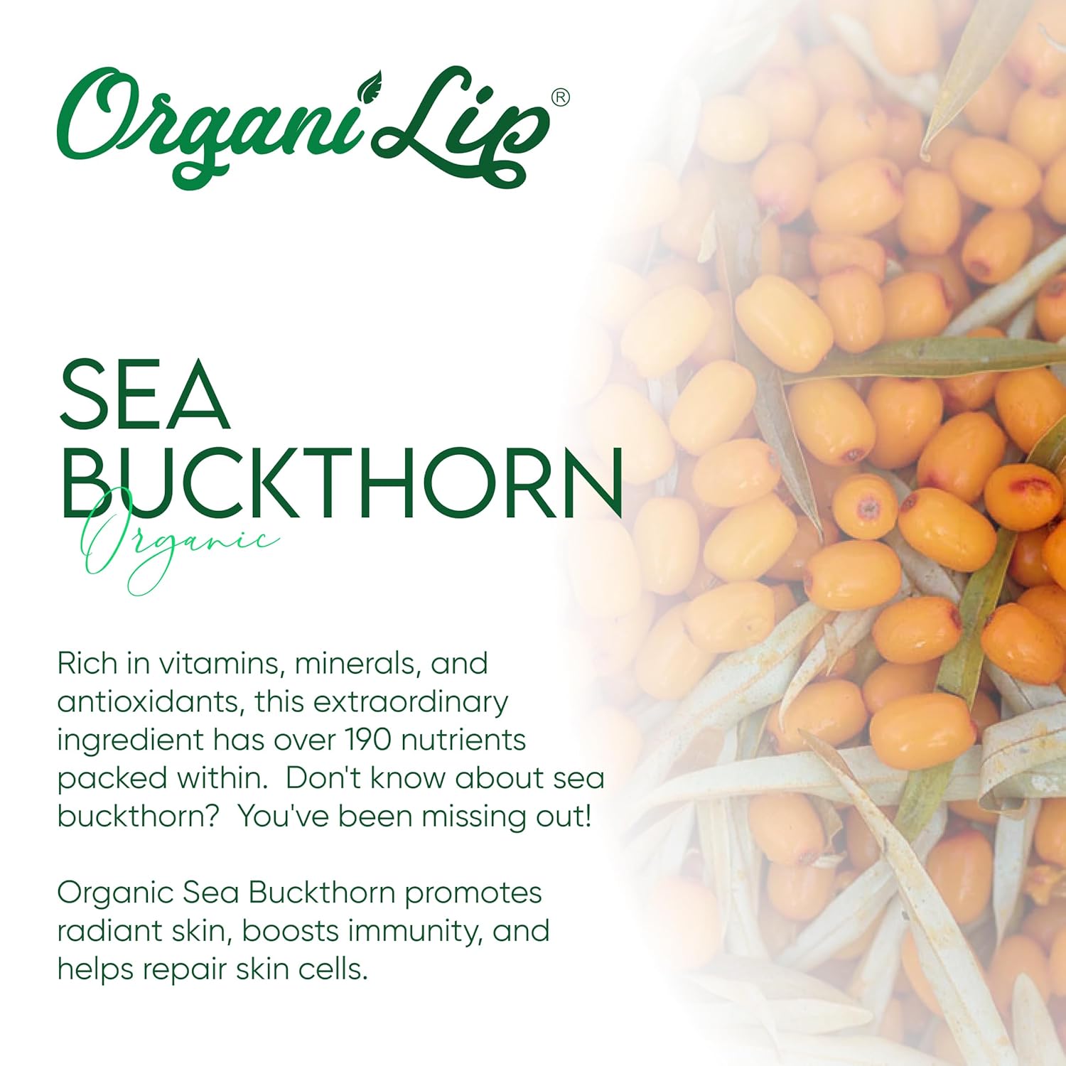 - WHY ORGANIC SEA BUCKTHORN? Sea Buckthorn Oil, derived from the sea buckthorn plant that grows high up in the Himalayas, has over 190 nutrients that promote skin health and contains high amounts of palmitoleic acid, which has skin repairing properties