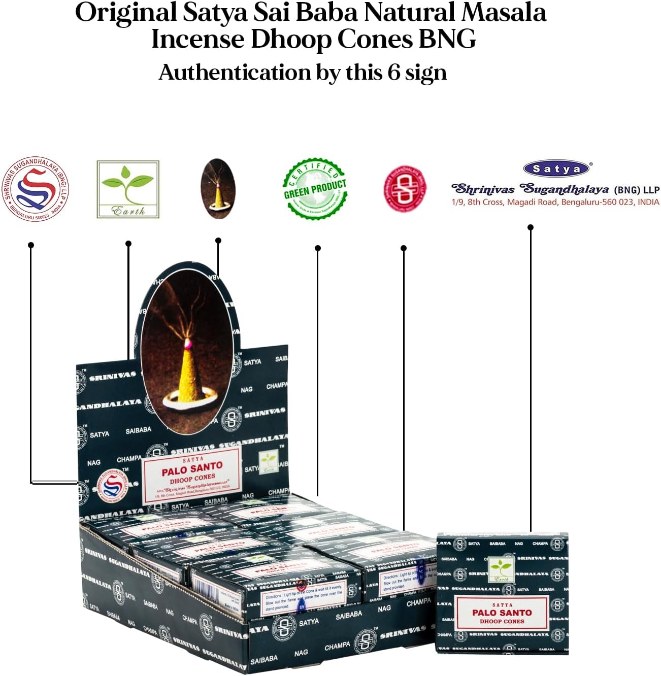 Satya Sai Baba Palo Santo Original Earth Marked Natural Masala Incense 144 Dhoop Cones in Pack of 12 Boxes | Best for Prayer, Meditation and Relaxation