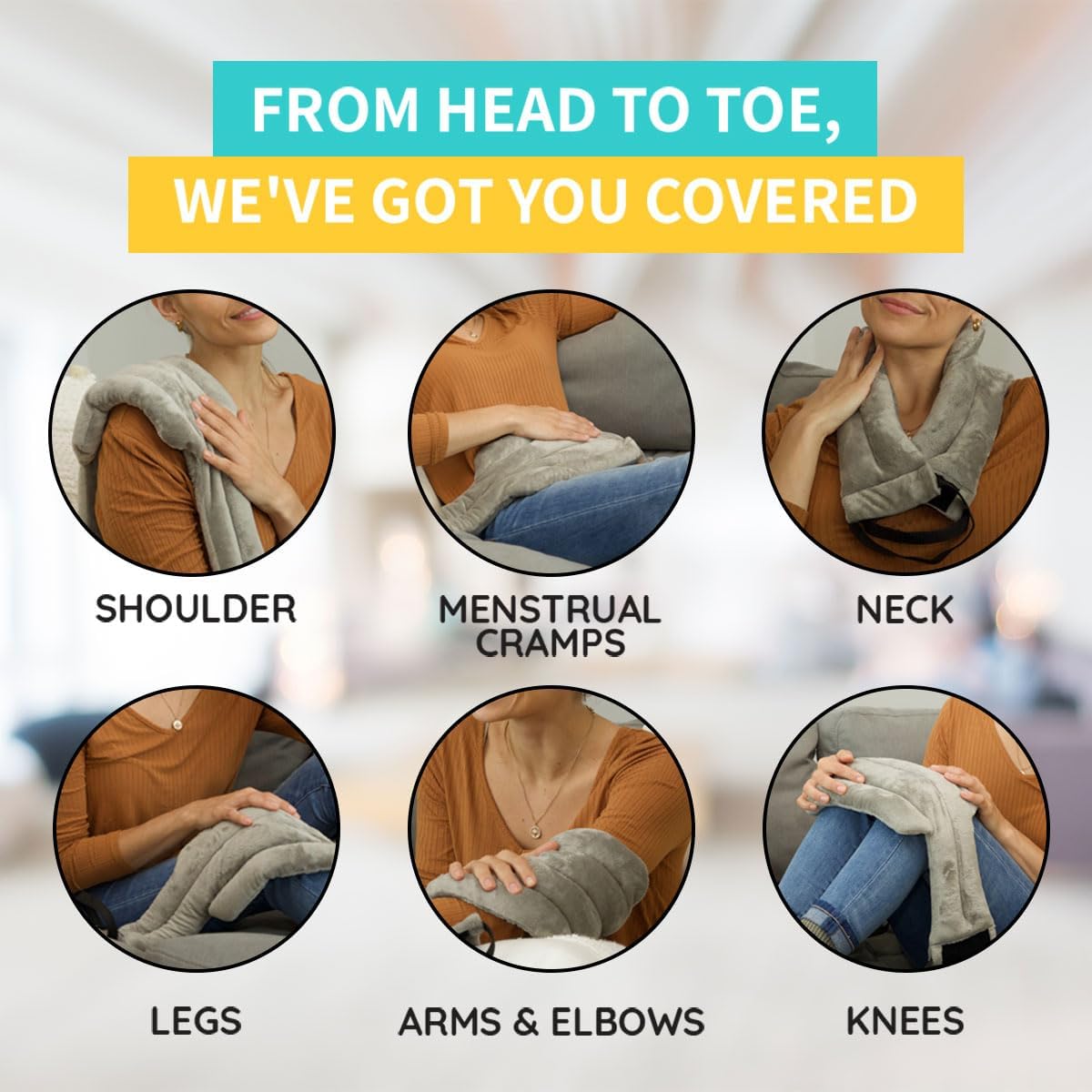 - FLEXIBLE & VERSATILE: Our heating pads heat up quickly and can easily be applied to any part of your body. It can be used as a neck heating pad, shoulder heating pad, or wrap heating pad for your back. Get relief on any part of your body that needs soothing. Our microwave heat pad even uses it's ideal weight to hold it in place and gently deliver heat therapy pressure.