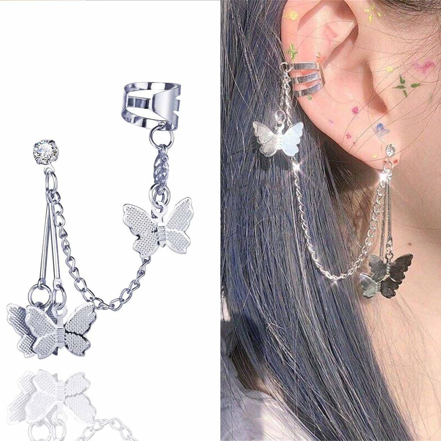 Silver Butterfly Chain Tassel Cuff Earrings Vintage Long Butterfly Hinge Dangle Drop Earrings Single Butterfly Ear Clips Statement Butterfly Crawler Cuff Earrings Jewelry for Women Girls