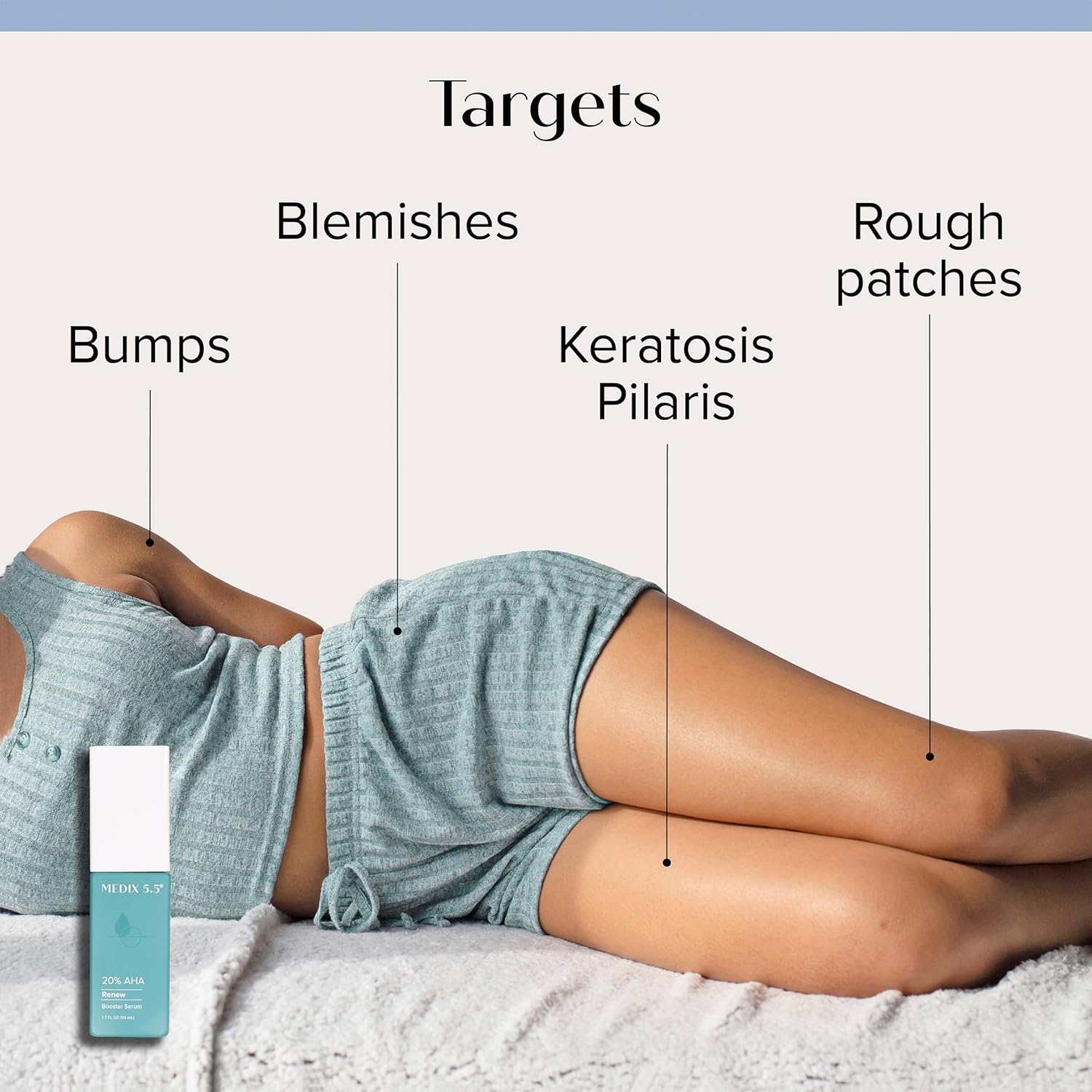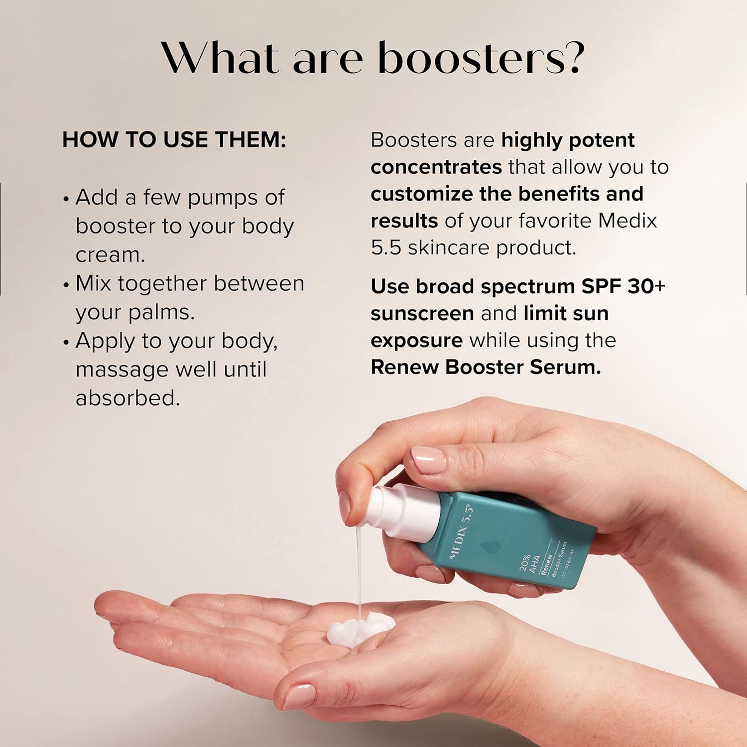 - BOOSTER – Supercharge your regular skin care routine by adding this highly effective + concentrated 20% AHA Exfoliating Glycolic Acid Renew Booster Serum formulated to be combined with your favorite Medix 5.5 body moisturizer treatment cream, but can also be added to your favorite body moisturizer, body oil, facial serum, face moisturizer, etc.