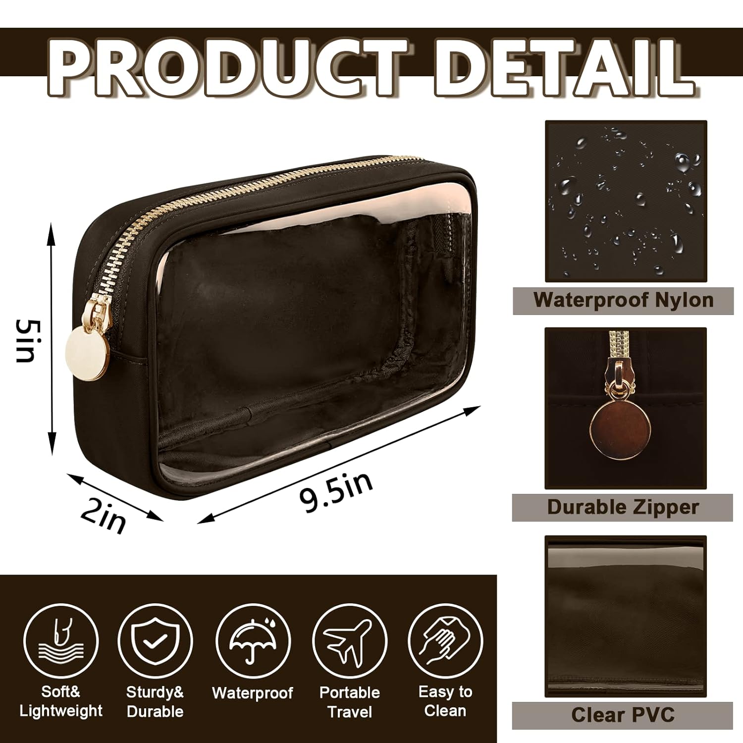 Clear Small Makeup Bag with Zipper, Nylon&PVC Cosmetic Travel Bag Preppy TSA Approved Toiletry Bag for Women Girls, Transparent Waterproof Makeup Pouches Cute Travel Bag for Purse(Small-Chocolate)