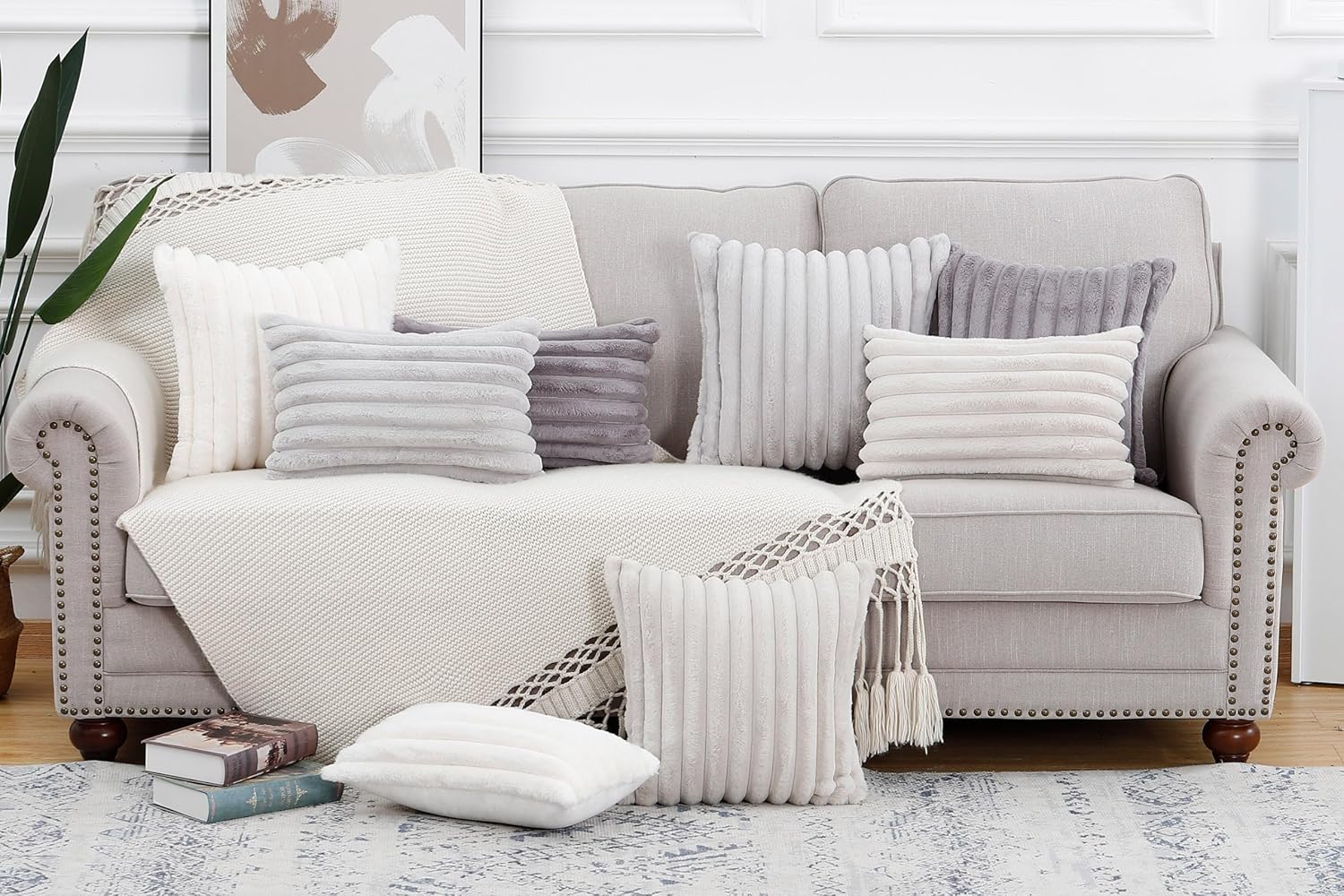 MADIZZ Set of 2 Faux Wool Plush Decorative Throw Pillow Covers 22x22 Inch Light Grey Fluffy Striped Soft Decorative Cushion Cover for Sofa Bedroom Pillow Shell
