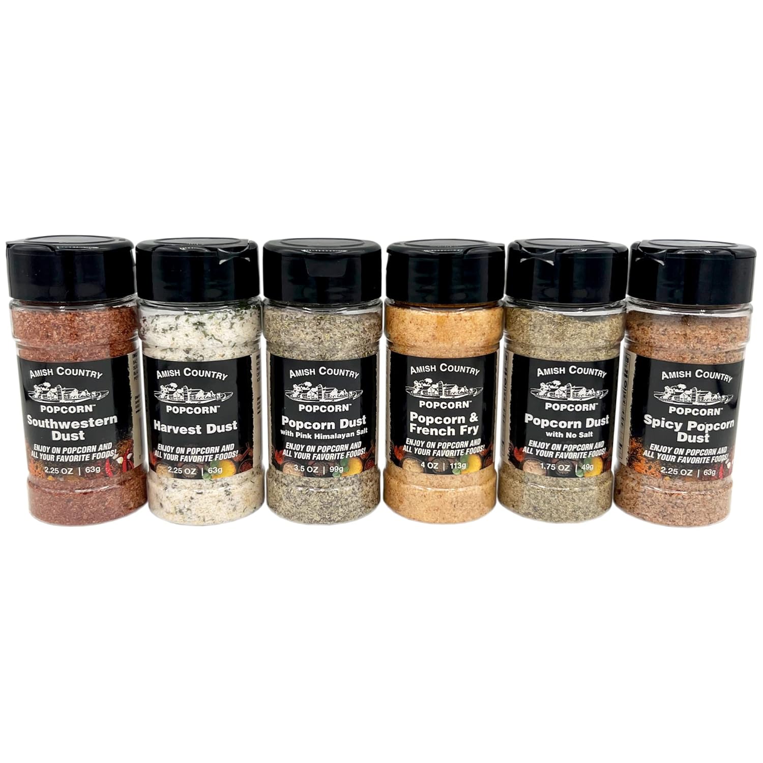- 5 PACK POPCORN DUST SAMPLER - Variety is the spice of life. Try a variety of our newest Popcorn Dust seasonings on your Amish Country Popcorn. Each sampler includes Harvest, Southwest, Popcorn Dust with Pink Himalayan Salt, Popcorn and French Fry Dust, Popcorn Dust with No Salt and Spicy Popcorn Dust. Try them alone or combine them, the possibilities are endless.