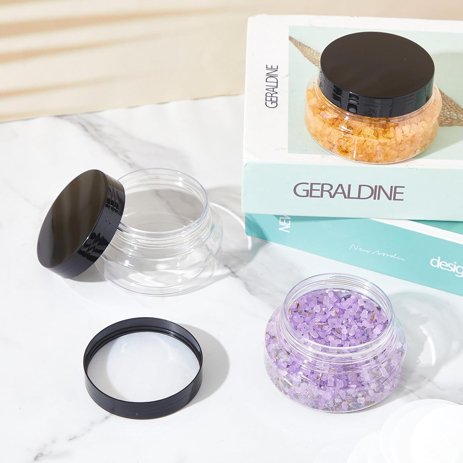 Tessco 48 Pcs Plastic Jars with Lids and Labels Body Scrub Jars Round Refillable Cosmetic Containers Empty Butter Travel Containers for Sugar Scrub Lotions Cosmetics Cream (5 oz,Clear)