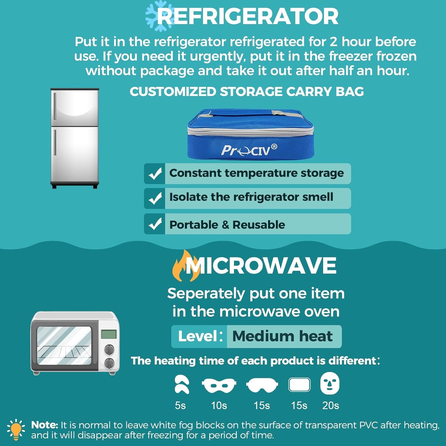 - ❄🔥❄【Hot and Cold Compress】ProCIV gel eye mask set can be chilled in the refrigerator for use as an ice pack, or heated in the microwave as a heated eye mask. Has good temperature storage effect, 𝐊𝐞𝐞𝐩 𝐈𝐜𝐞/𝐖𝐚𝐫𝐦 for up to 𝟐𝟓-𝟑𝟎 𝐌𝐢𝐧𝐬. Effectively amazing for tired eyes relief, fatigue, dark circles, puffiness and the wrinkles. Note: Put it in the 𝐅𝐫𝐞𝐞𝐳𝐞𝐫 frozen for 𝐍𝐨 𝐌𝐨𝐫𝐞 𝐓𝐡𝐚𝐧 𝐇𝐚𝐥𝐟 𝐀𝐧 𝐇𝐨𝐮𝐫. If the time is too long, it will become frozen and hardened.