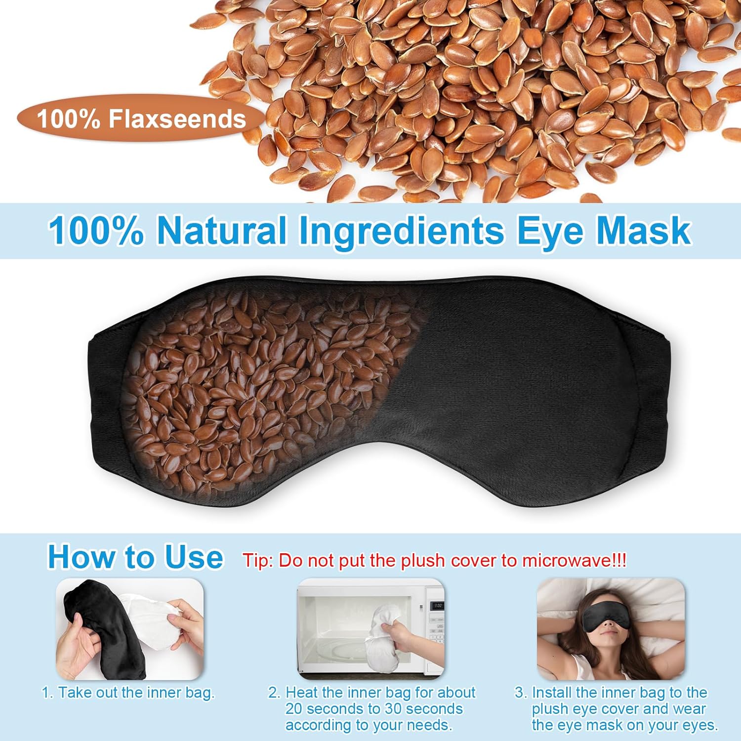 - [Nature Comfort Smell Eye Mask] This natural sleep mask is filled with flaxseeds, the scent is nature, comforting, refreshing and relaxing. The flaxseeds has a high heat storage and heat transfer effect when microwave heated, you will feel warm and moisture around your eyes with wearing it.