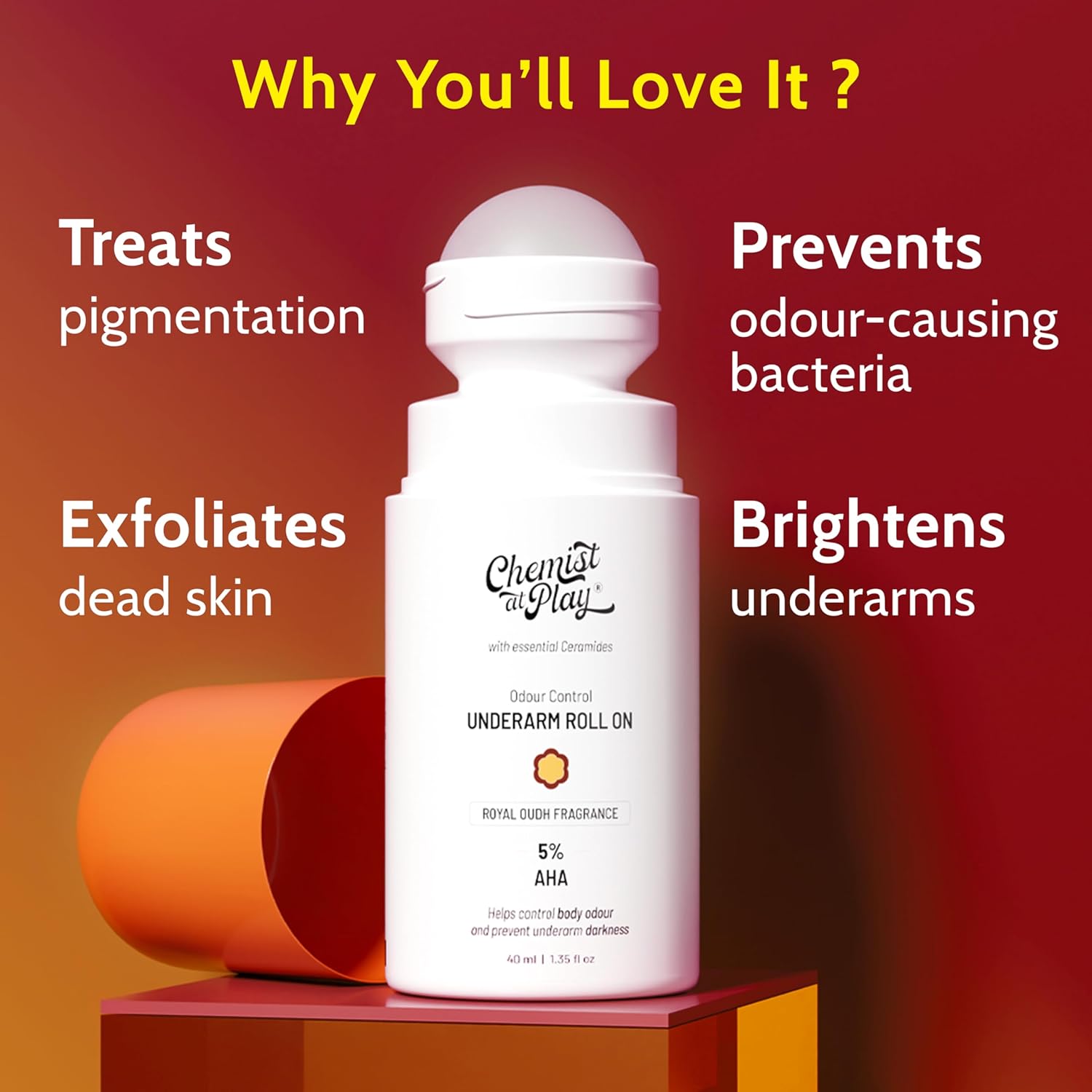 UnderArm Roll-On with 5% AHA| Lactic & Mandelic Acid|Prevents Odour, Brightens Skin & Exfoliates Underarm| For Sensitive Skin|Royal Oudh Fragrance | Alcohol & Aluminium Free|1.35 fl oz
