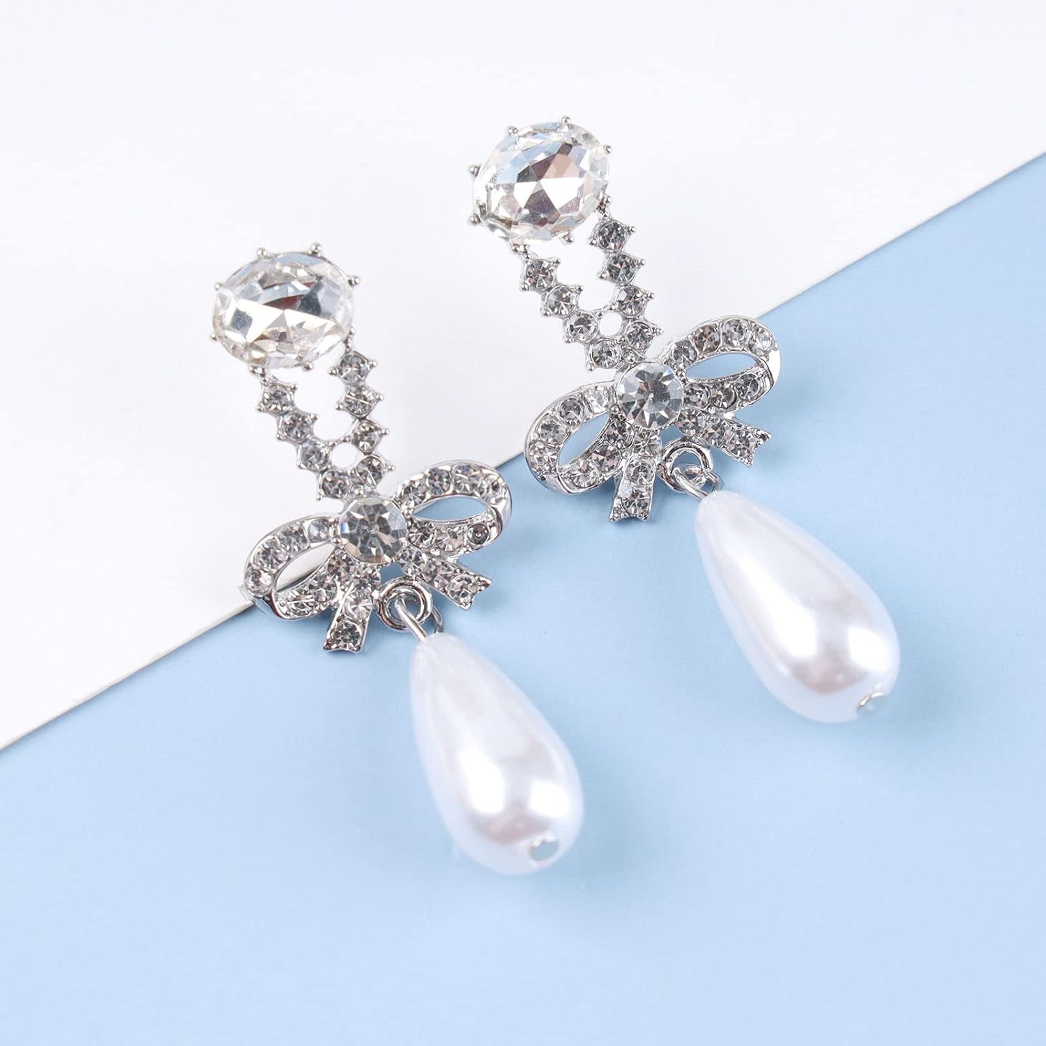 Vintage Teardrop Pearl Dangle Earrings Long Cz Pearl Drop Earrings Silver Crystal Bow Stud Earrings Rhinestone Pearl Bridal Earrings Jewelry for Women