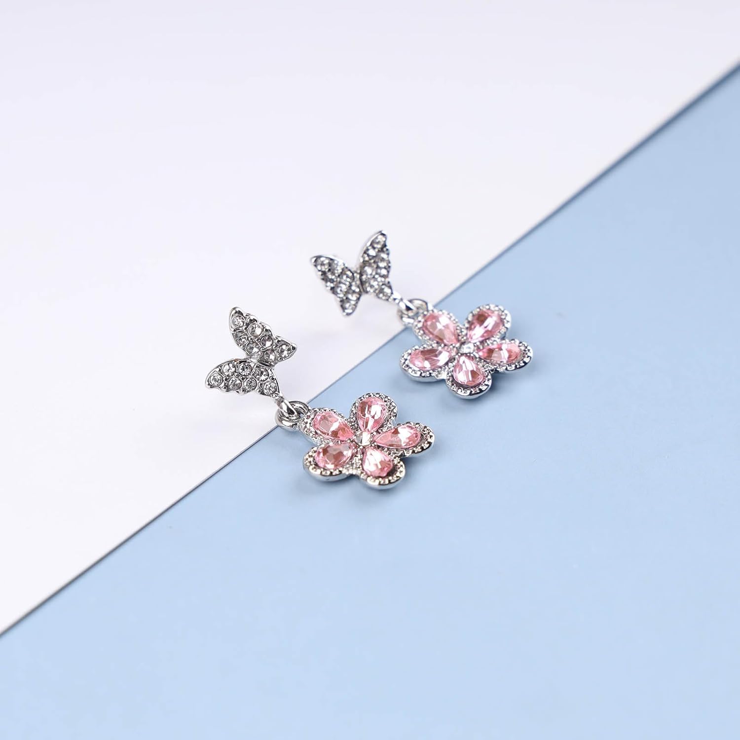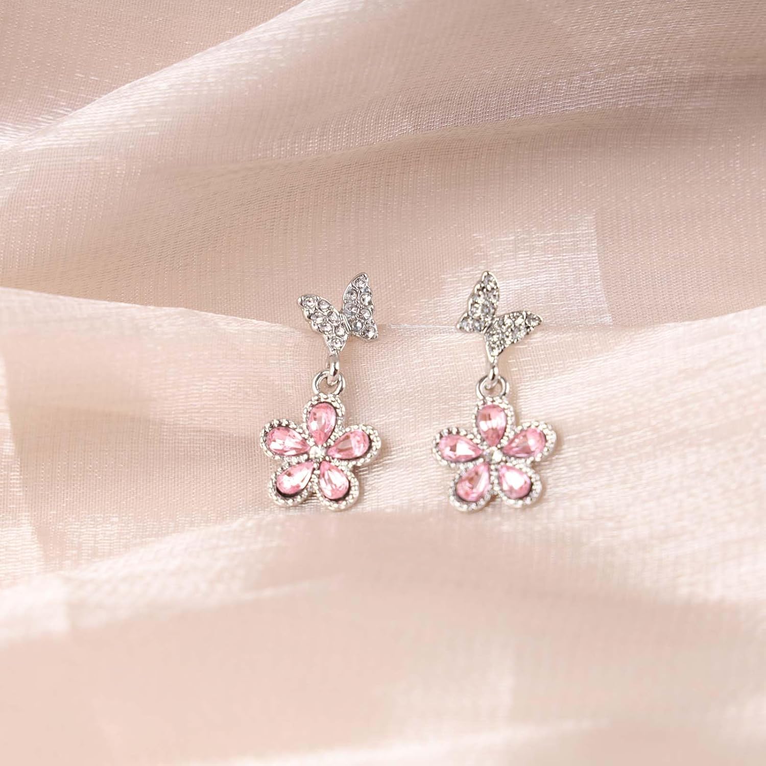 Vintage Pink Crystal Flower Earrings Butterfly Flower Drop Earrings Silver Rhinestone Butterfly Stud Earrings Pink Gemstone Butterfly Earrings Jewelry for Women