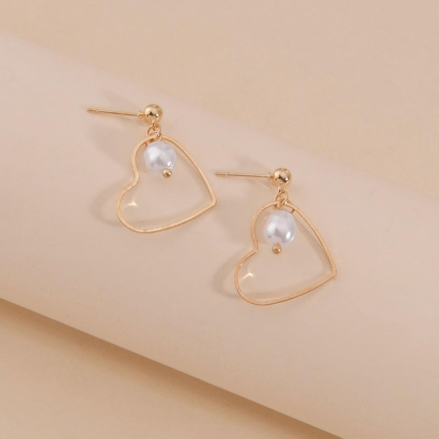 Boho Tiny Pearl Heart Drop Earrings Vintage Gold Hollow Heart Dangle Earrings Statement Faux Pearl Heart Hoop Earrings Jewelry for Women
