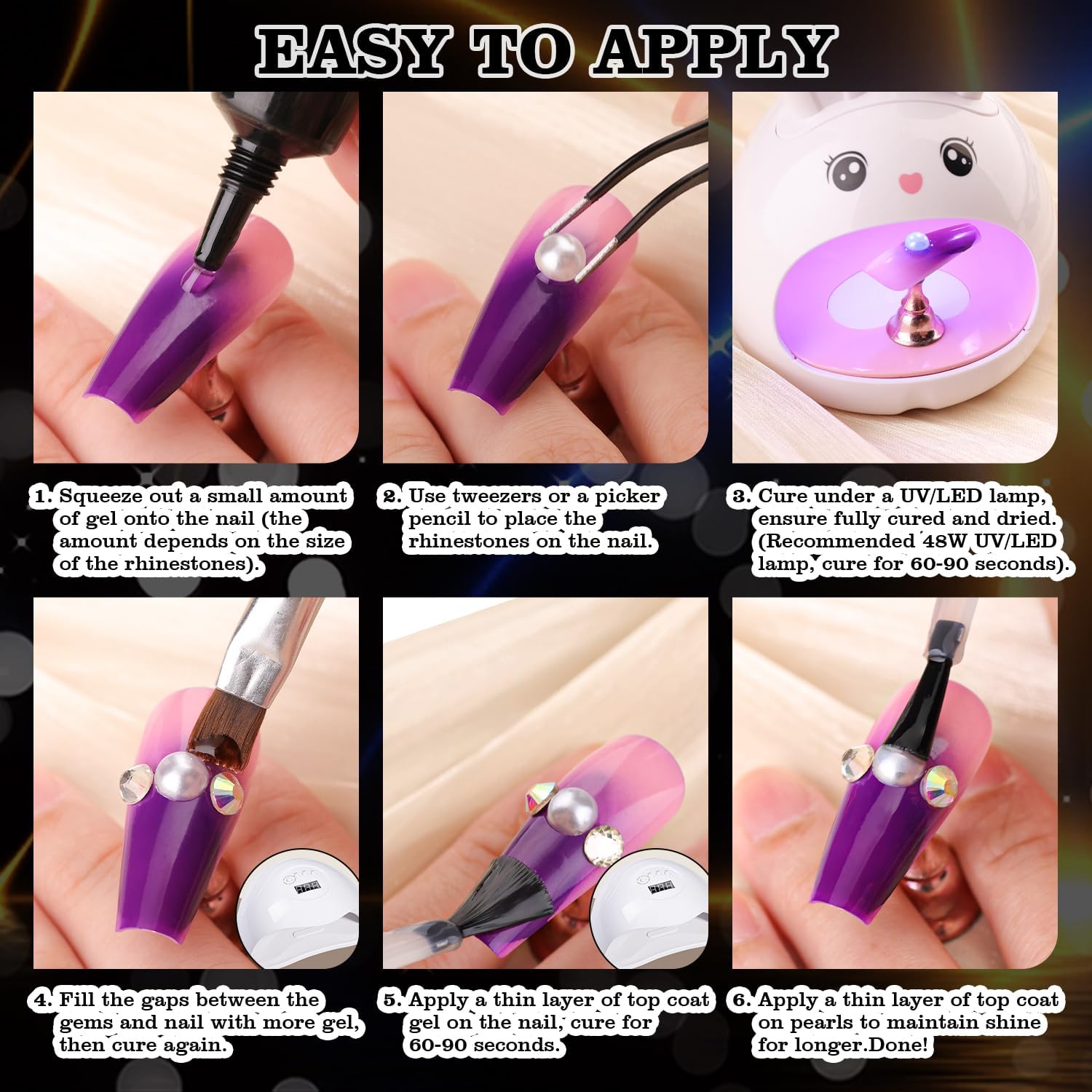 - 💎ADHESIVE GEL GLUE -- The crystal clear nail gem glue uses a special, non-toxic and eco-friendly formula with strong tackiness, adhesion, and fluidity for easily applying decorations. It is a type of UV gel glue. After proper curing under a UV/LED lamp, the glue dries clear with superior bonding strength that can last weeks without falling off. With the designed tip, you can easily and conveniently apply the glue to the nail bed or the surface of false nails.