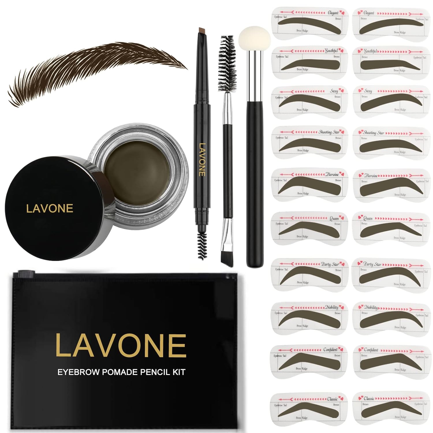 - [What’s in the eyebrow kit]: LAVONE makeup eyebrow kit includes brow pencil, eyebrow powder 20 eyebrow stencils (10 different shapes), a sponge applicator, a dual precision brush and a zipper pouch for on the go.