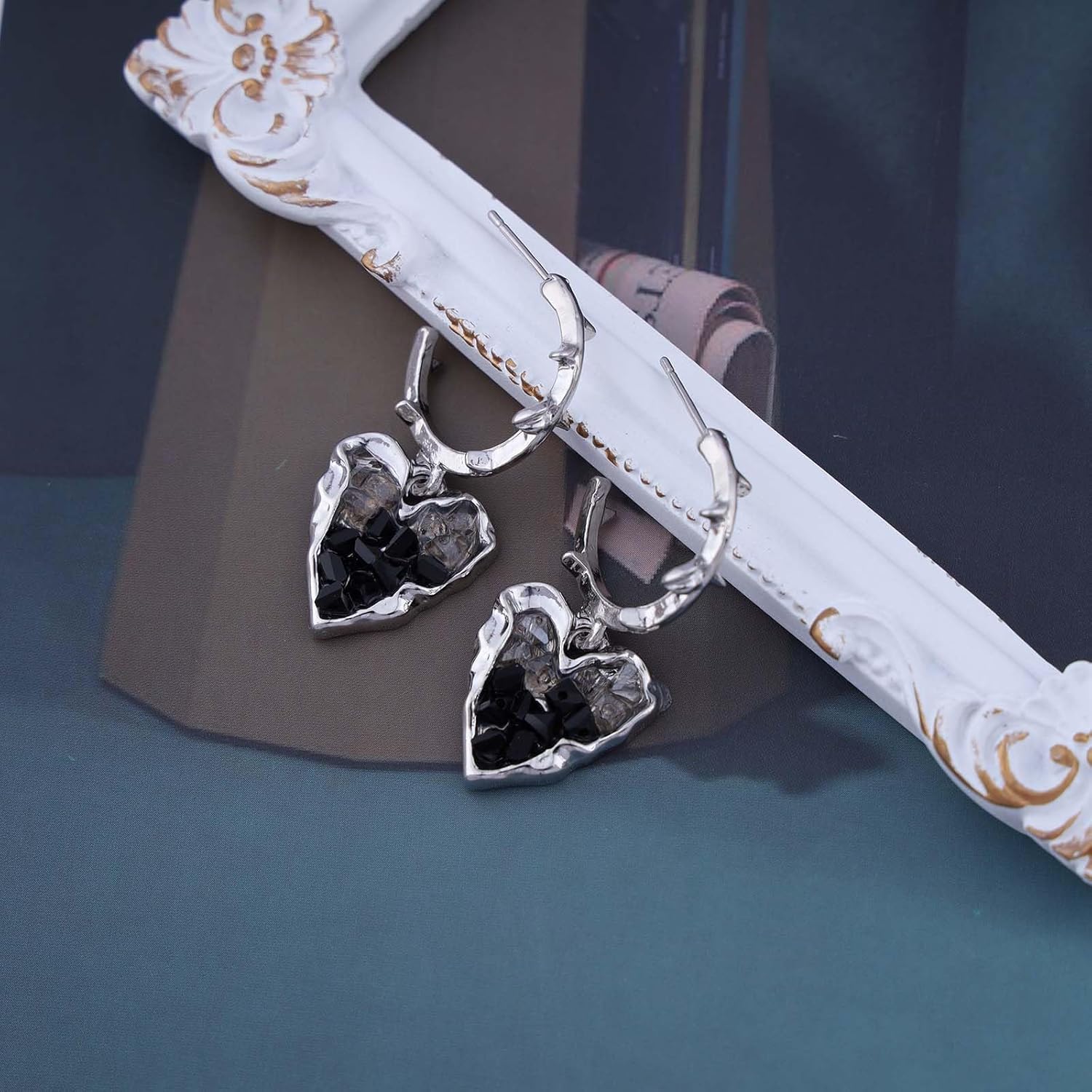 Punk Heart Dangle Earrings Black Onyx Heart Earrings Silver Open Circle Hoop Earrings Gothic Heart Drop Earrings Jewelry for Women