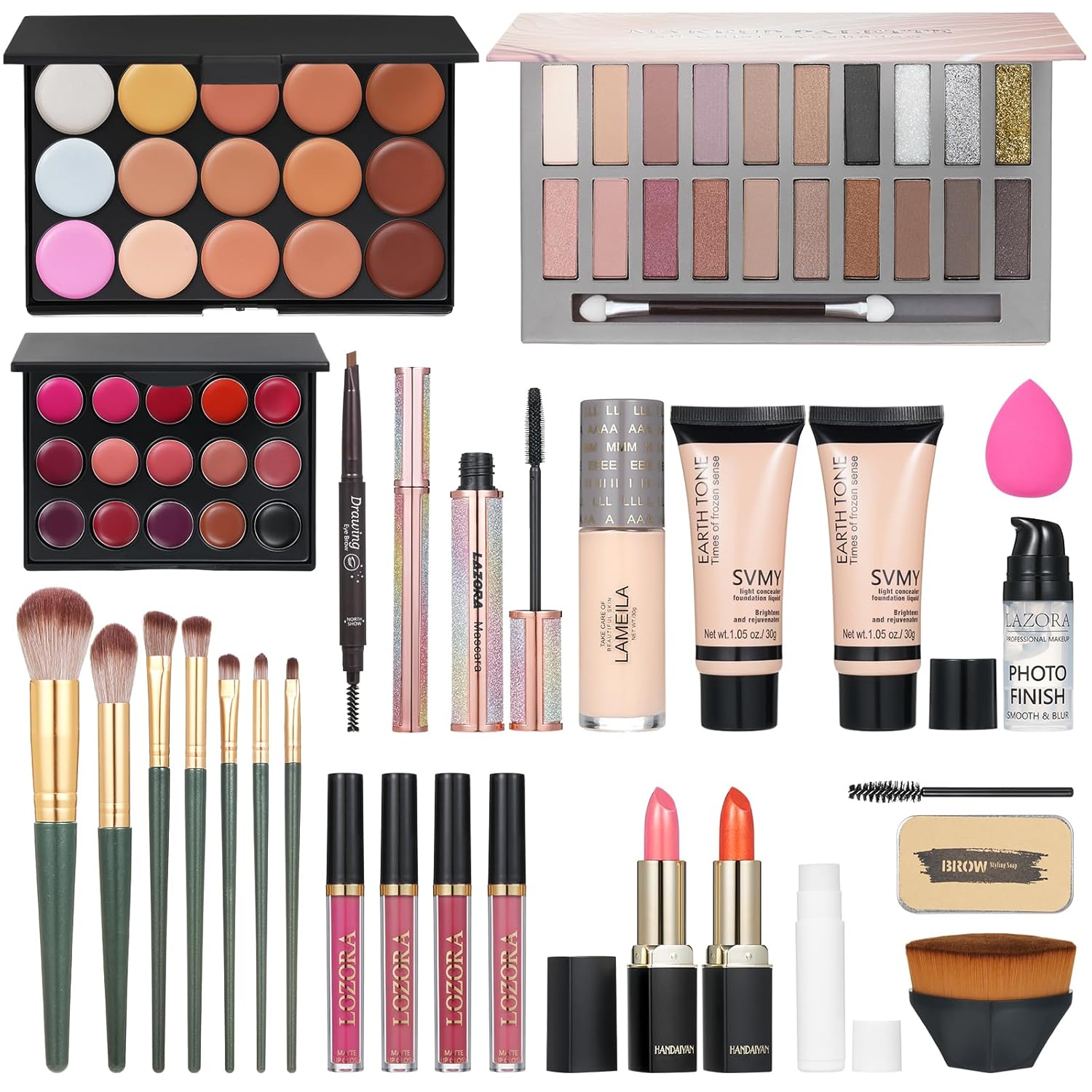 - PRODUCT INCLUDES - Includes a variety of cosmetics and makeup accessories such as 20 color eyeshadow palette, concealer, lipstick, foundation, BB cream, brown body lotion, mascara, lip gloss, eyeshadow, contour stick, eye liner, eyebrow pencil, lip balm, makeup brushes, makeup primer , makeup case, corrective makeup.