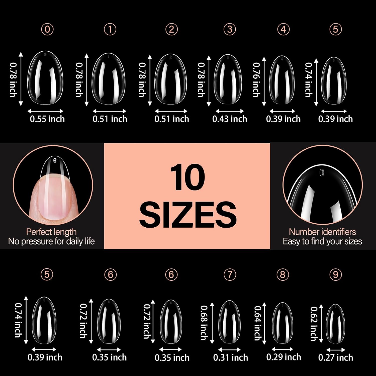 - Multiple Sizes Option: Our preshaped nail tips include different sizes with each size 42pcs, totally 504pcs, providing you with more options to choose. For the extra sizes, they can be easily trimmed and shaped to suit your preferences, giving you the freedom to express your creativity, avoiding waste. Regarding the dispute about the length of full nail tips, everyone’s nail bed length is different. It is recommended to refer to the size chart when purchasing.