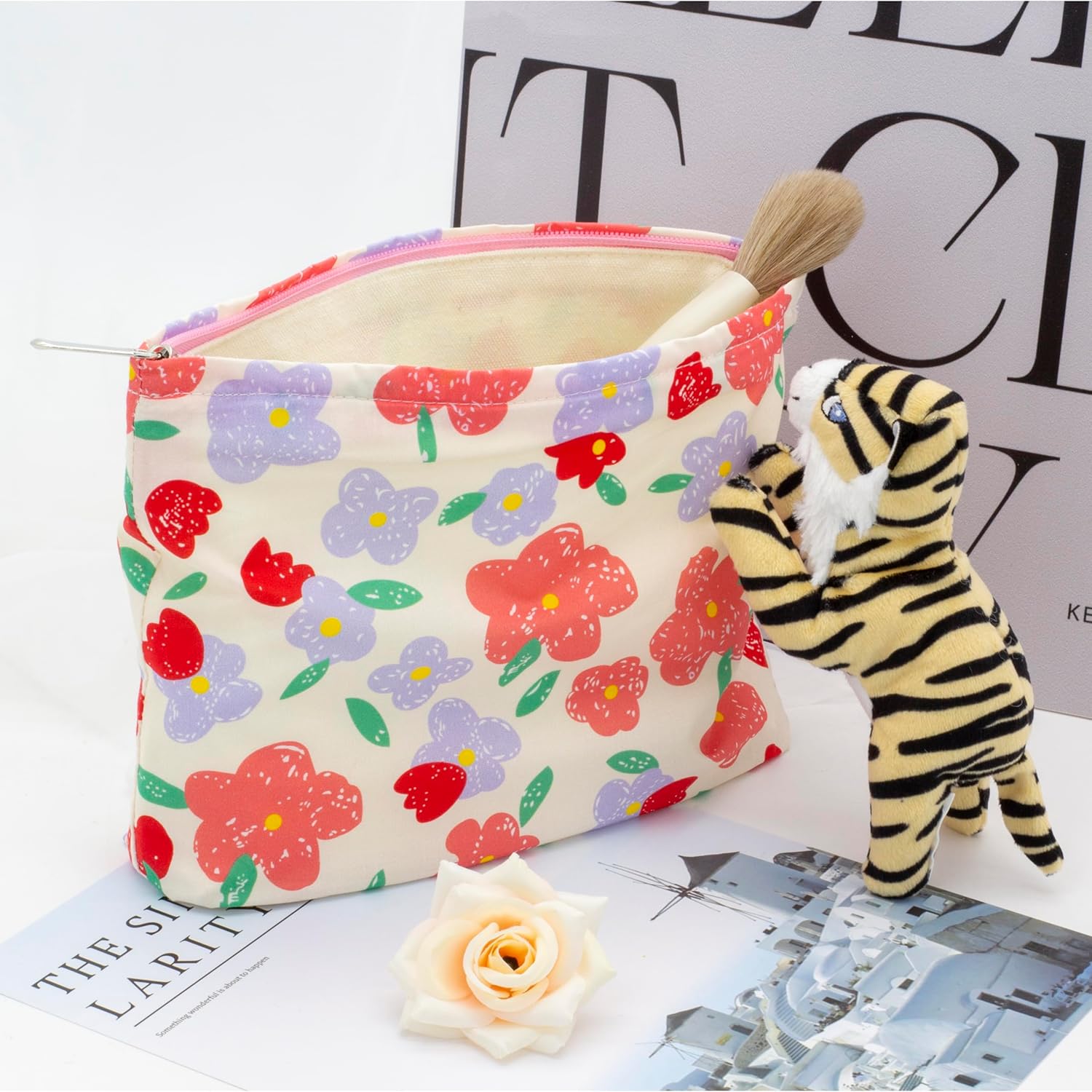 Floral Makeup Bag Large Cotton Zipper Pouch for Purse Travel Canvas Make Up Organizer for Women Cosmetic,Flower Pink